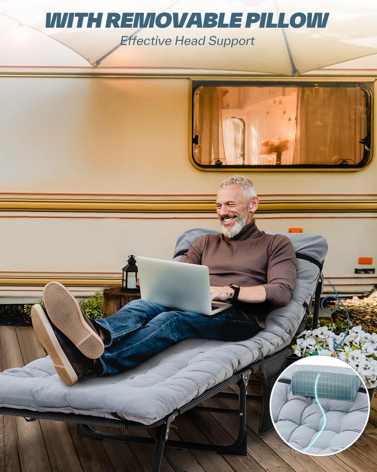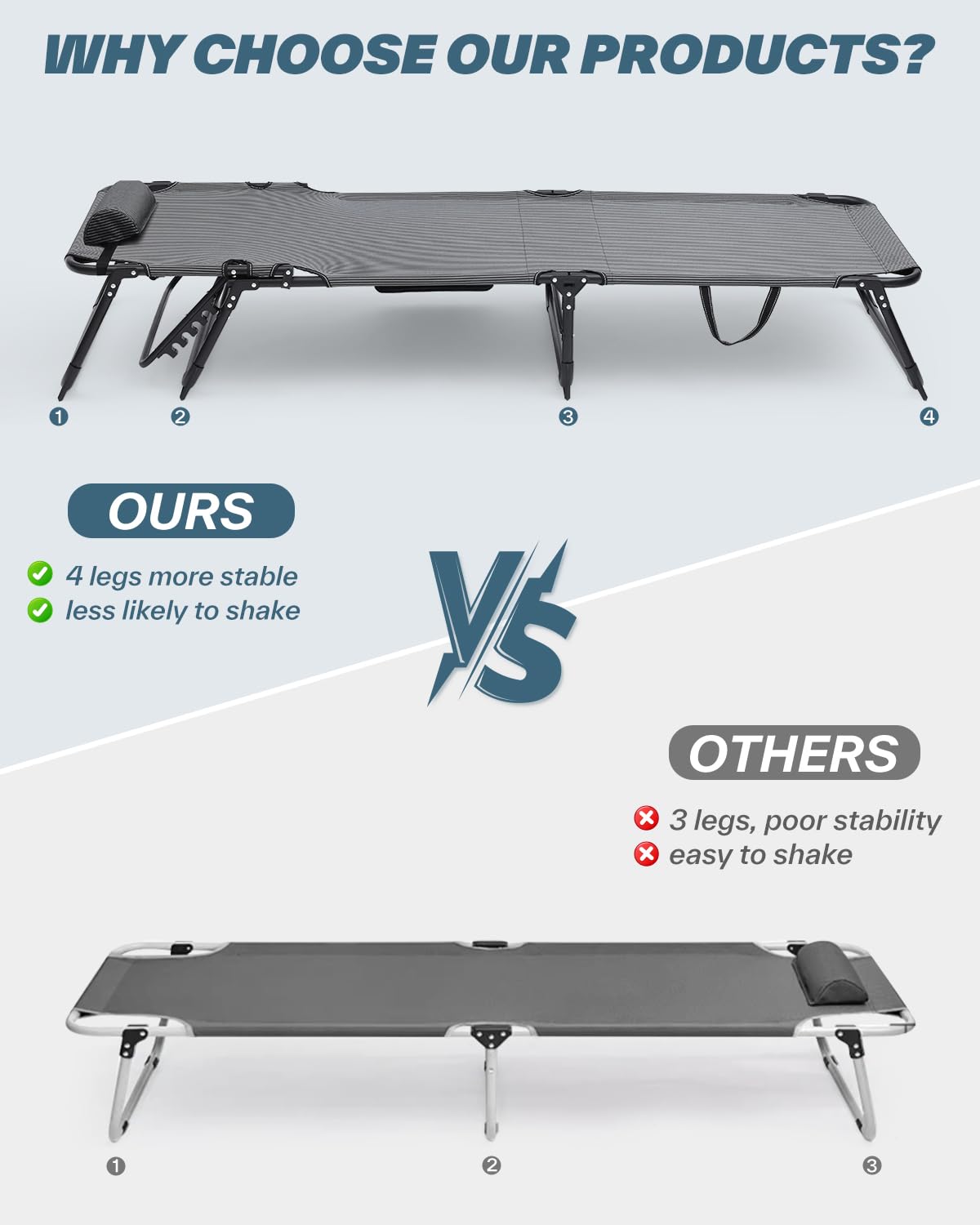 - PORTABLE AND VERSATILE: This camp bed free assembly, it can be unfolded for use, and can be folded up in 10 seconds. The folding design is easy to store and carry. Ideal for camping, patio relaxation, poolside lounging, balcony leisure, beach outings, travel, office naps, sunbathing, road trip, or as a convenient guest bed when guests visit your home. Enjoy the convenience and versatility it brings to your lifestyle with our bed!