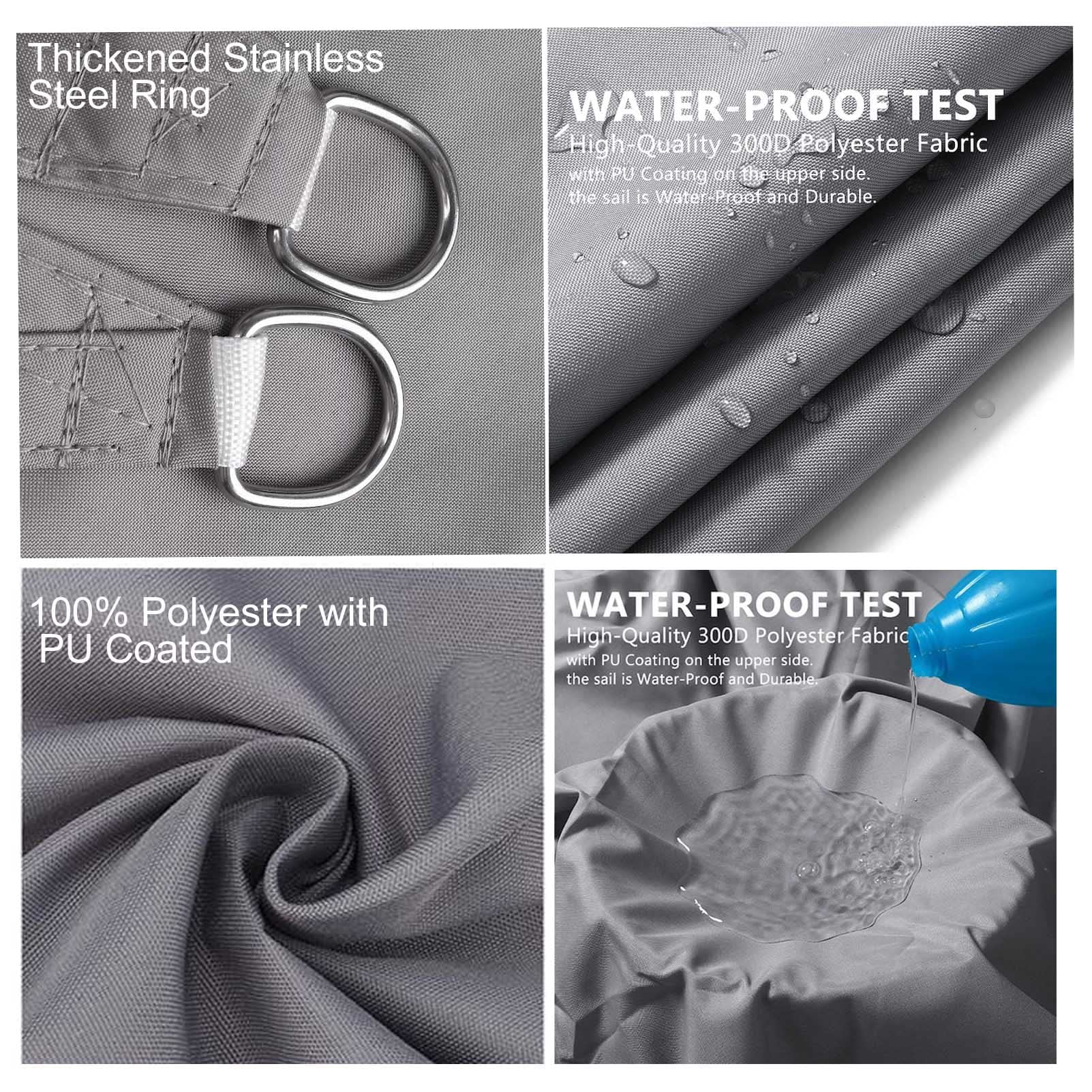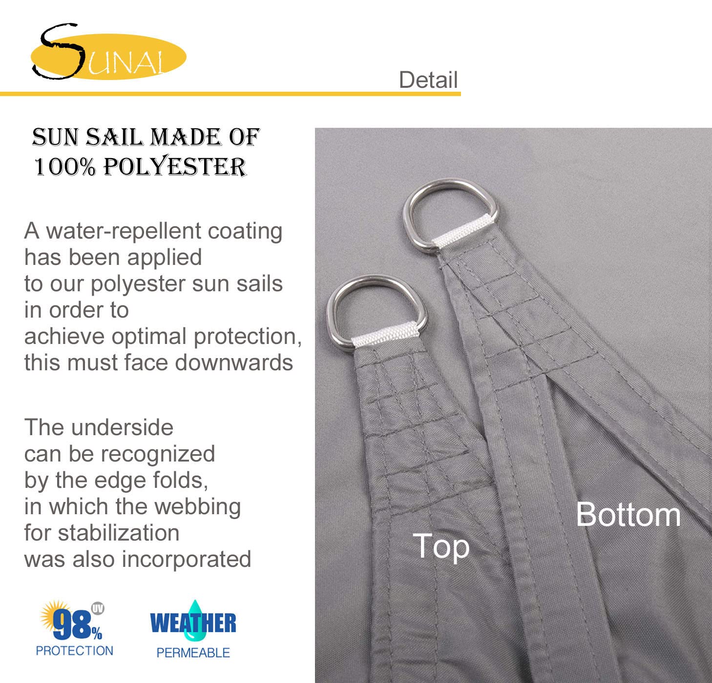 - High Quality Material: Sunal Shade Sail, Made of New High Density Polyester Fabric with Double Layer PU Waterproof Coating (420D PES), Environmentally Friendly, Odorless, Waterproof, Tear Resistant, Mildew Resistant, Stain Resistant, Durable, Also Provides Very strong stability and elasticity.