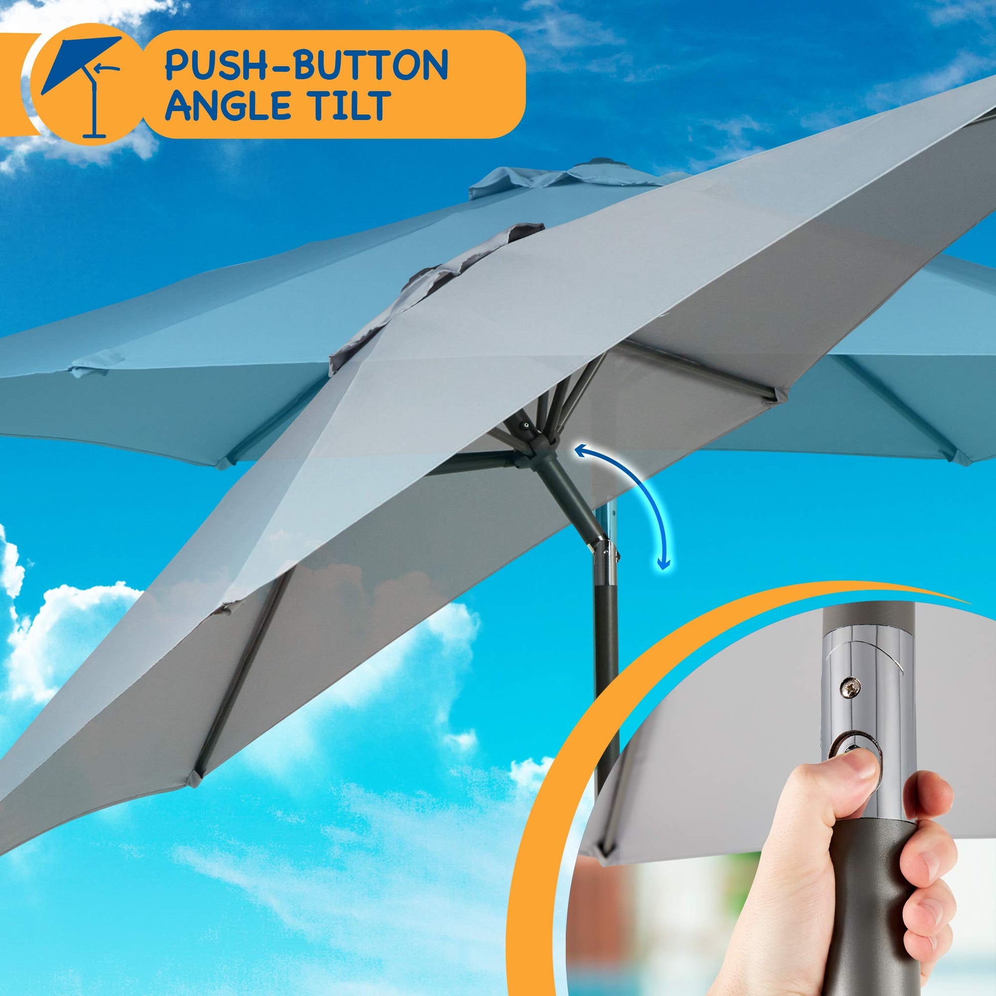 - EASY TO USE AND STORE: This parasol has a crank system which allows you to easily open and close the umbrella. The push-button angle tilt lets you angle and adjust the canopy for optimum sun protection. It can fold down neatly when not in use making it easy to store away.