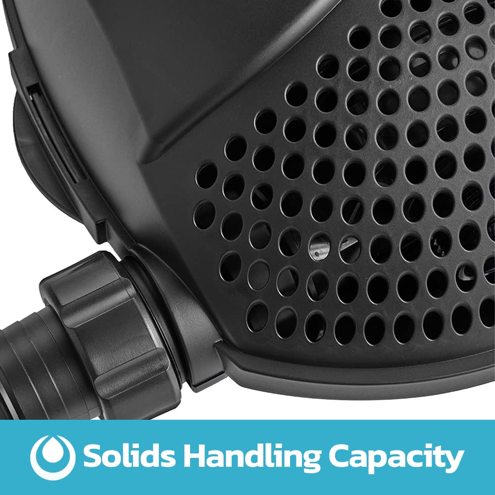 - Features a pump cage to prevent large items (or fish) from being sucked in.