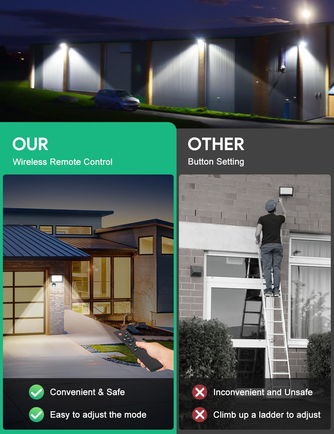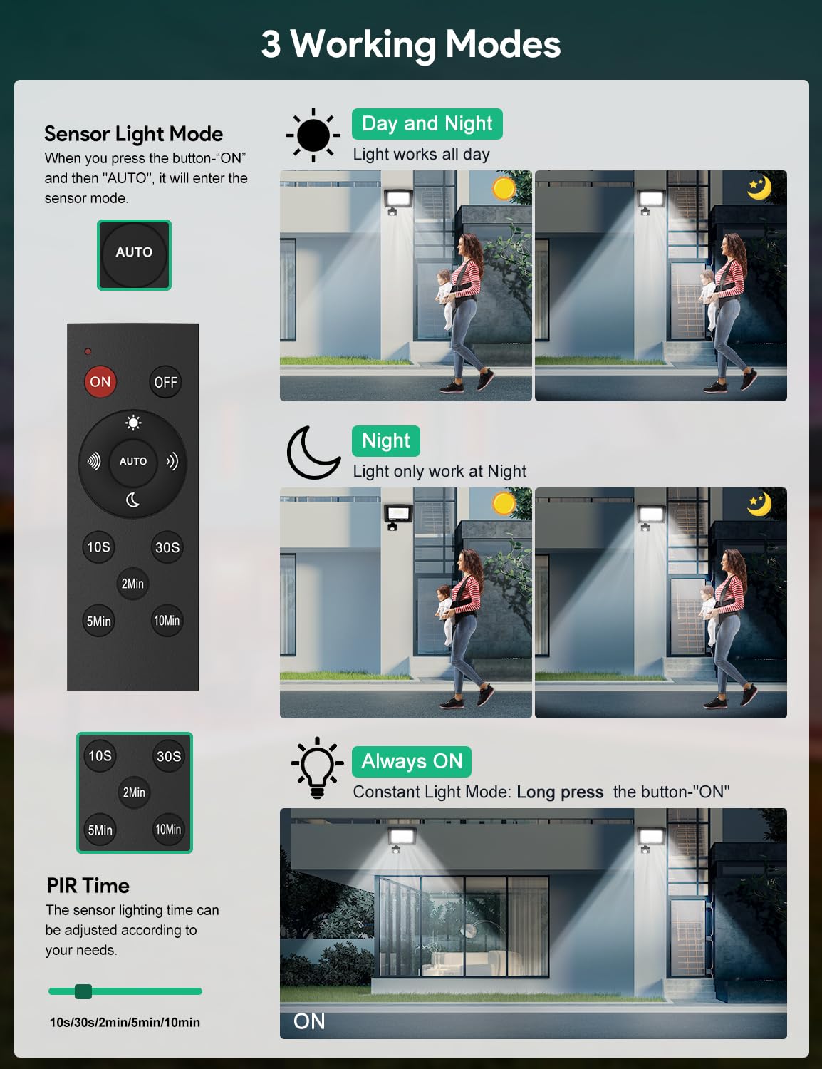 - 📱【Wireless Remote Control】Outdoor security lights with motion sensors come with a remote control, It allows for easy adjustment of settings such as sensing lighting time (10s/30s/2min/5min/10min), sensitivity (Max sensing distance up to 10m), and PIR motion sensor mode (All-Day/Night). You can also choose permanent lighting mode. The remote control adds the flexibility to turn the light on, saves all the hassle with a ladder, etc getting the best settings.