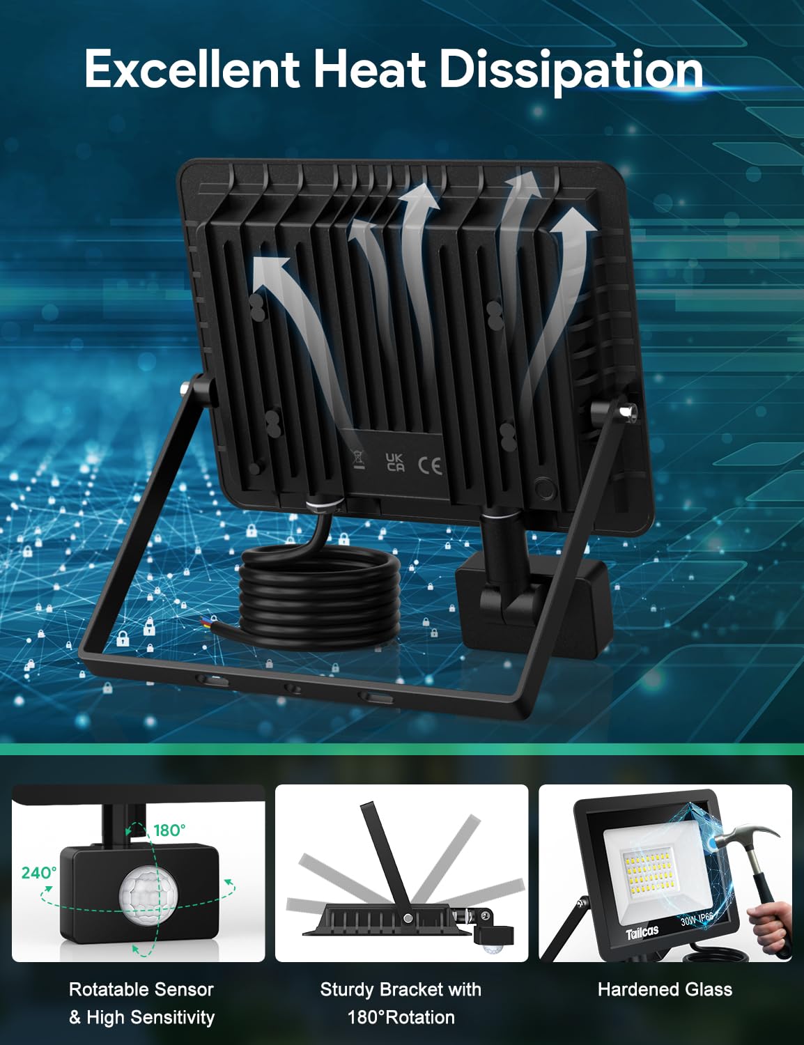 - 🔋【 Durable&Energy Saving】30W PIR lights outdoor can replace an old style halogen spotlight that was 400 watts, saving more than 80% on the electricity bill lighting. The led floodlights are constructed from die-cast aluminum material and tempered glass, Aluminum alloy shell brings good heat dissipation performance and corrosion resistance, which makes it more durable, with a service life of up to 50,000 hours.