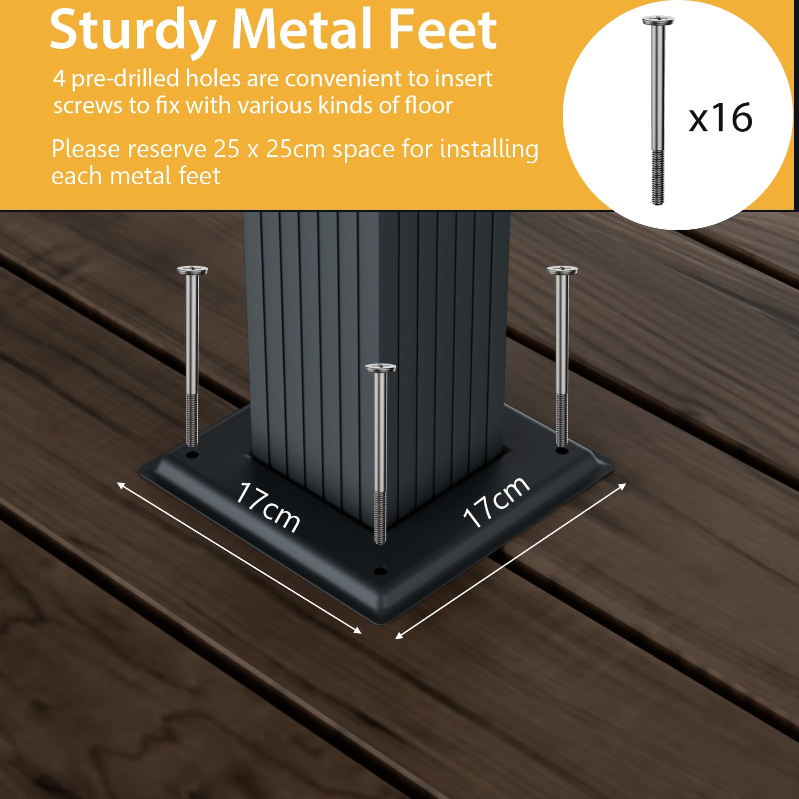 - STURDY & ROBUST CONSTRUCTION: Made of powder coated aluminium structure and fixed by screws, the sun shelter is hard to deform or bend. Apart from this, 4 widened columns offer powerful support to enhance stability.