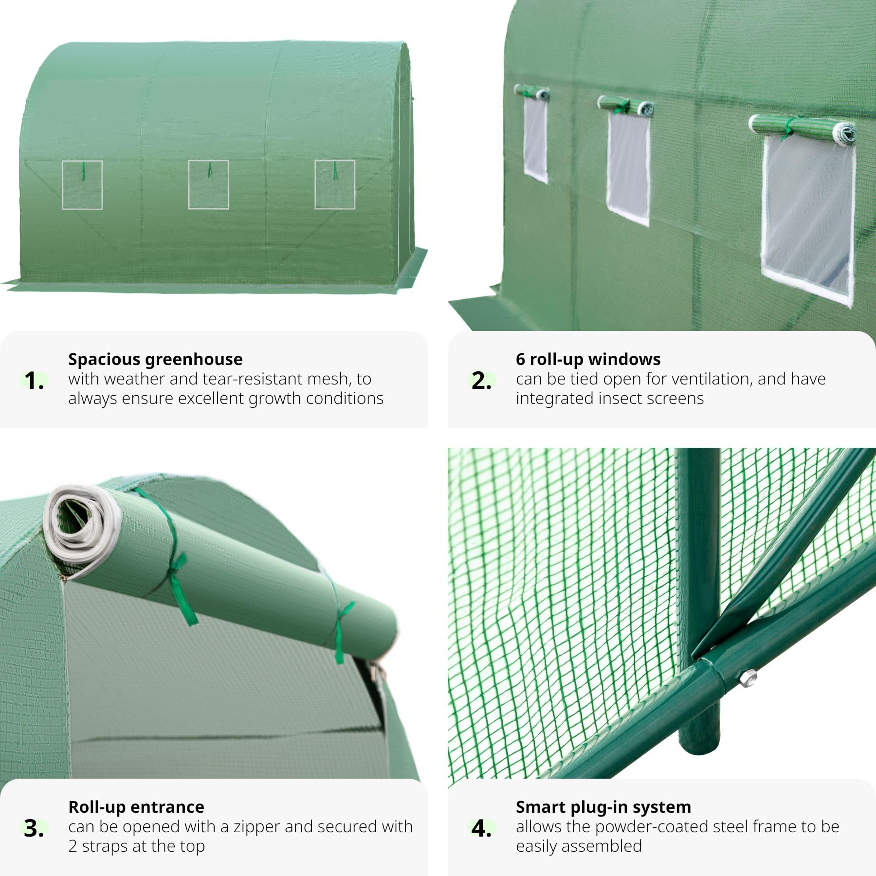 tectake® Greenhouse Polytunnel, Durable Steel Frame Grow Tent, PE Greenhouse Cover with Zip Door, 6 Mesh Windows, Frost-Resistant, 7m² Planting & Potting Space, Incl. Greenhouse Accessories - green