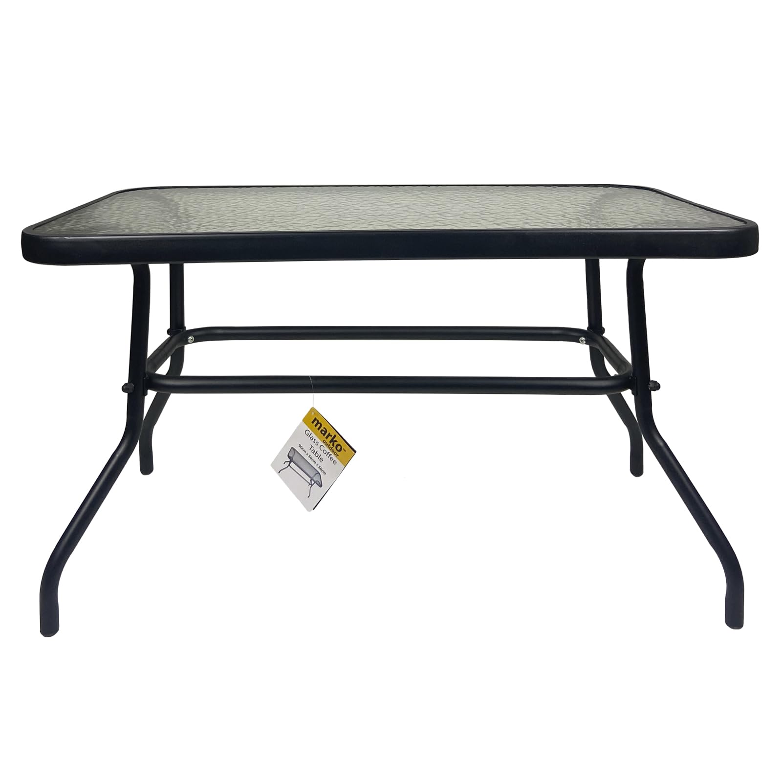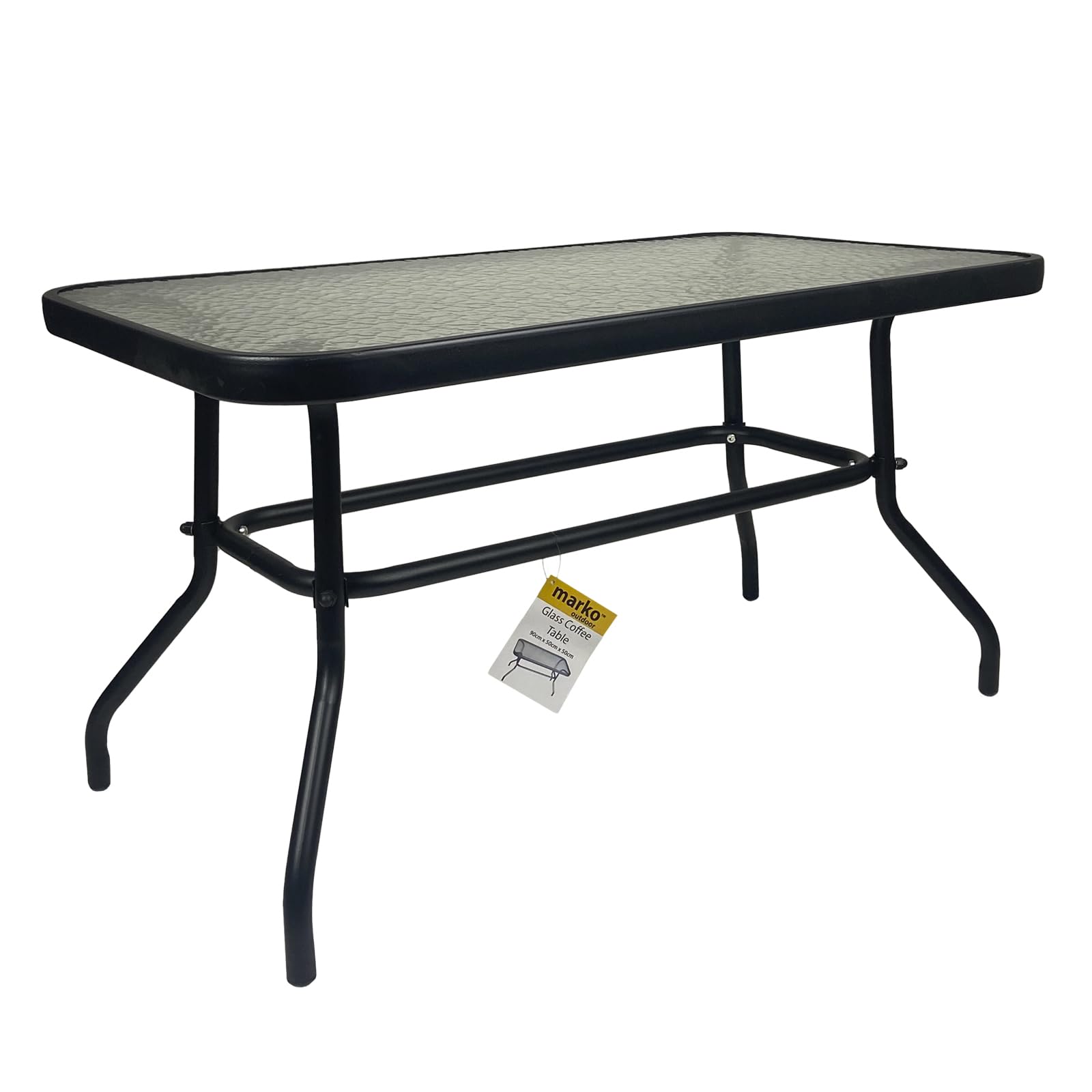 Details: Rectangular Rippled Tempered Glass Coffee Table The marko tempered ripple glass top coffee table is suitable for indoor and outdoor use and will compliment any scenery and room. made from strong tubular steel and tempered glass, the table is lightweight and easy to assemble! Features: Strong tubular steel frame Tempered glass topped table Ideal for indoor and outdoor use Rubber feet for seadiness Simple assembly Product Specification: Height: 49.5 cm Width: 90 cm Depth: 50 cm Weight: 8 kg All measurements are approximate and taken at the maximum points of the item, unless otherwise stated.