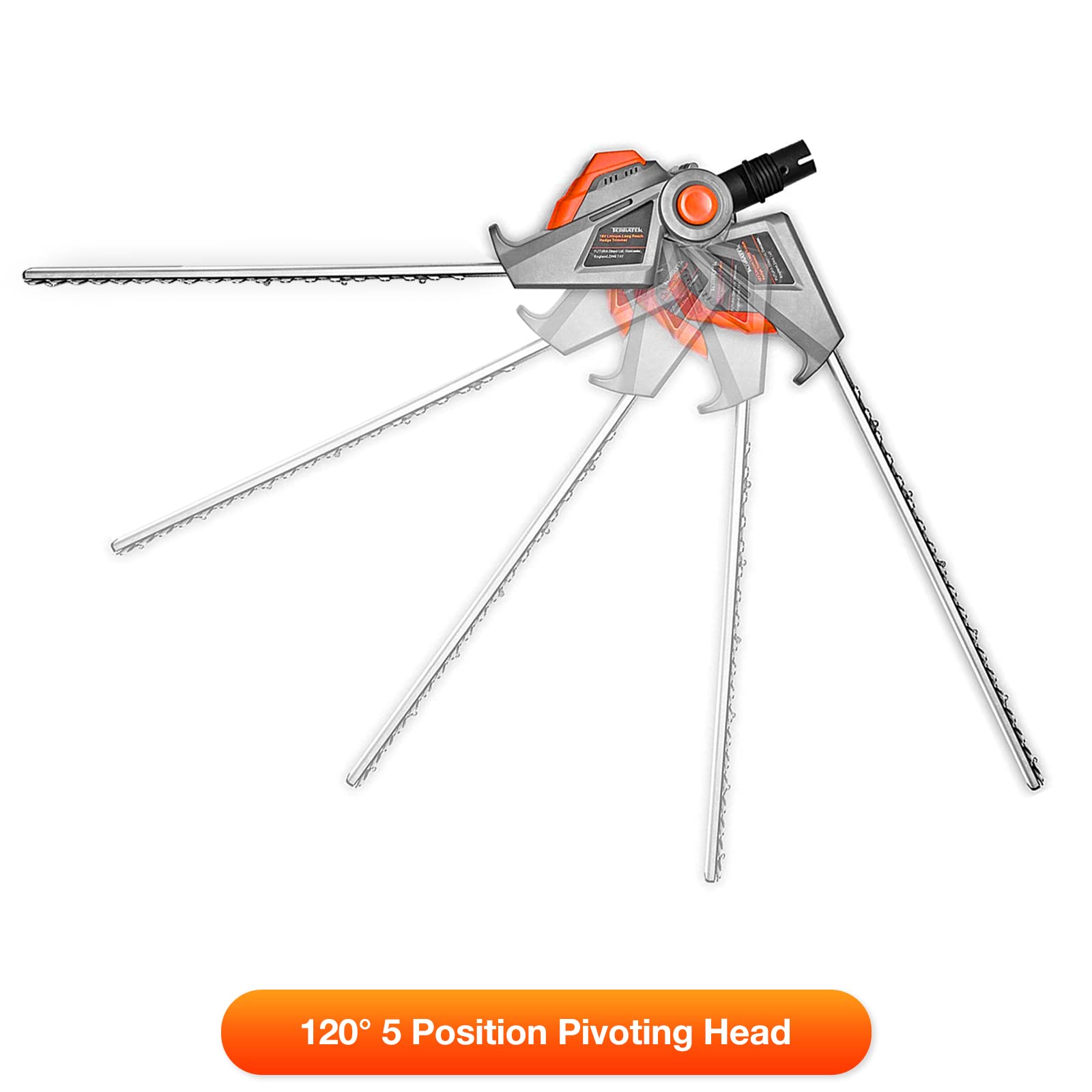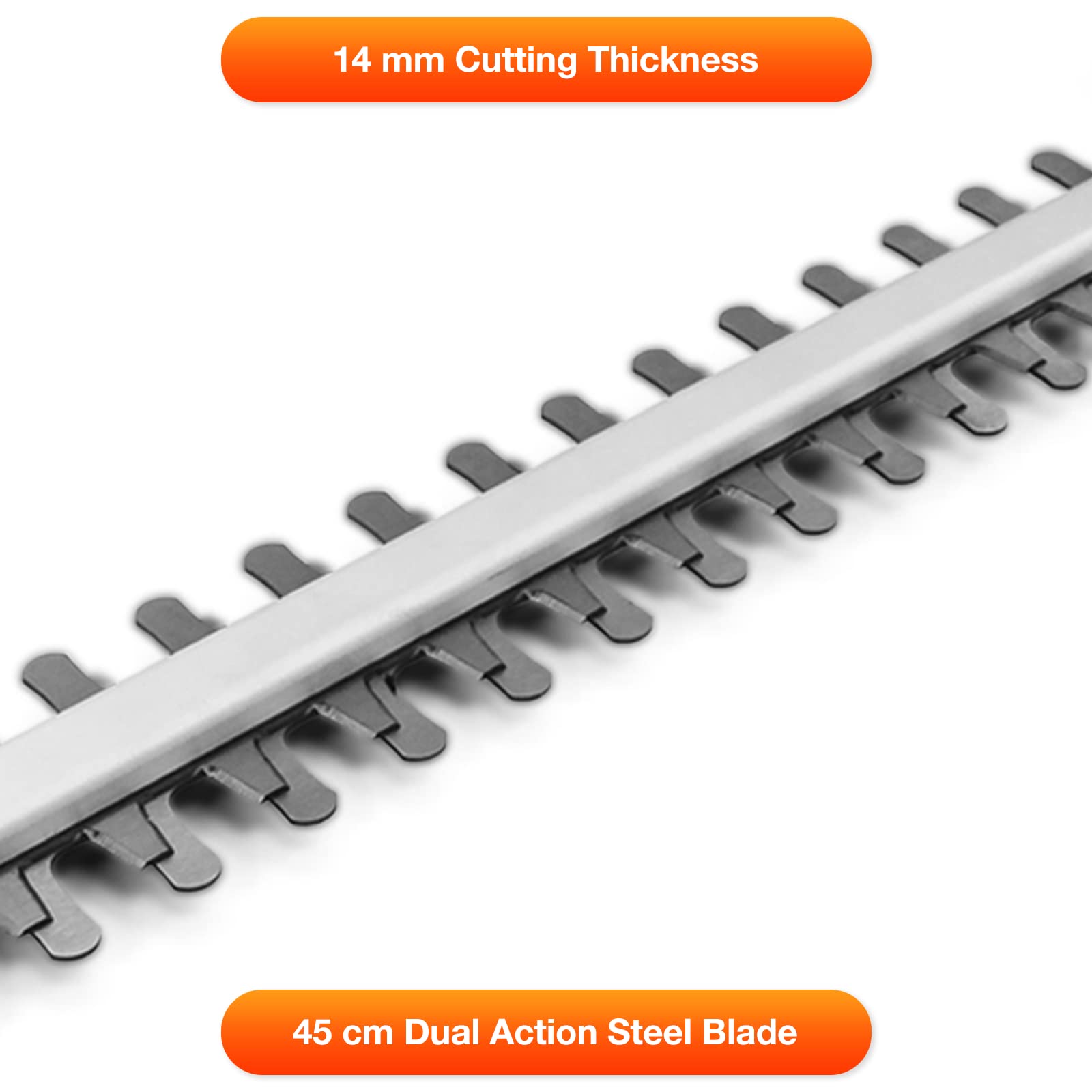 - Adjustable Cutting Head: A 120° 5 position pivoting head allows for the easy trimming at the top or bottom of hedges. Weighing at just 3.5kg, the lightweight design makes it ideal for clipping tall, awkwardly-sited or hard-to-reach hedges and shrubs. Dual action 45cm in length hardened steel blades with aluminium blade support. The Hedge trimmer cordless comes with a 2 stage safety switch to protect you while using the long reach electric hedge trimmer.