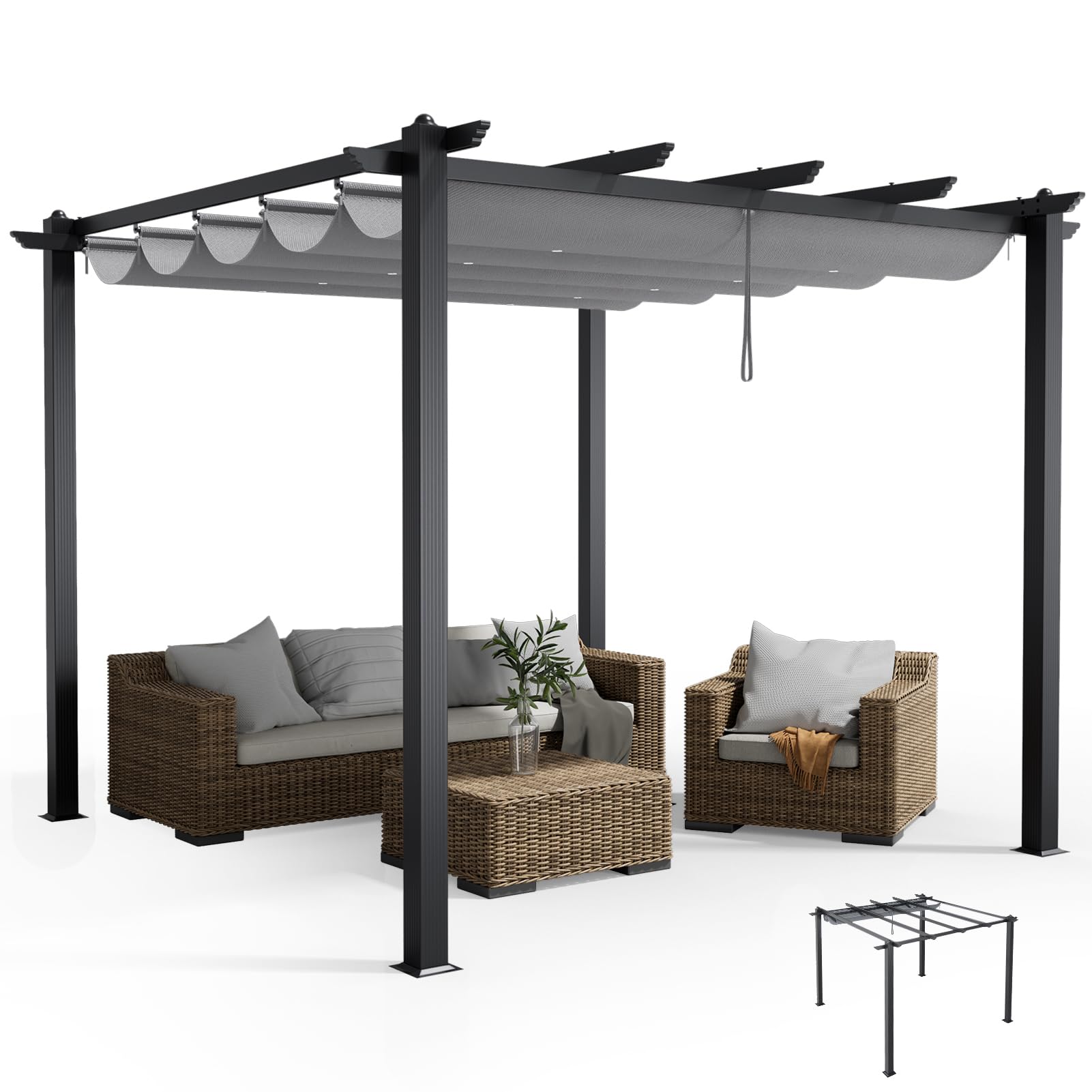 The Fellie 3M x 3M Aluminium Pergola with Retractable Roof, Outdoor Garden Gazebos Water-resistant, Large Metal Retractable Pergola Sun Shade Shelter for Garden, Patio, Poolside, Party, Light Grey