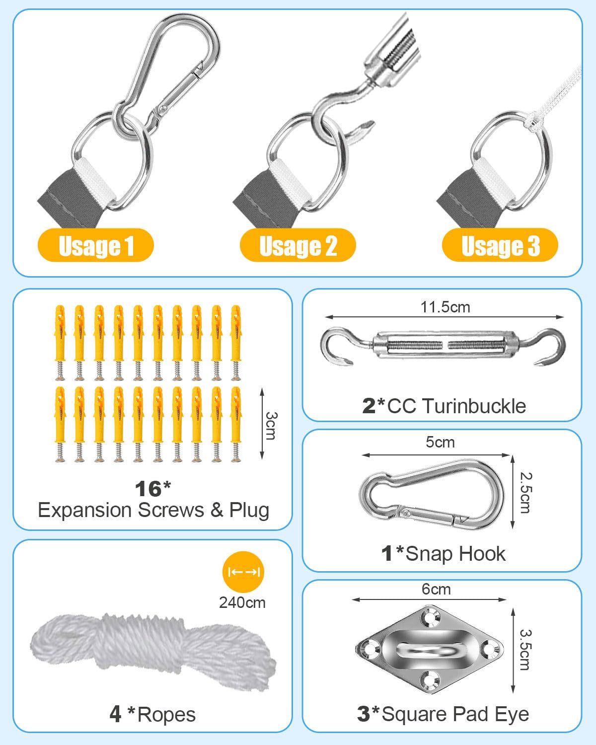 - ⛱️Installation: Featuring D-shaped stainless steel rings at each corner, our garden shade canopy is effortlessly hung and exceptionally stable. Complete with a comprehensive set of accessories including 4 x 2.4m ropes, 3 x pad eyes, 1 x carabiner, and 2 x awning tighteners, along with 16 screws and screw sleeves, installation is both easy and secure, allowing you to set it up wherever desired with confidence.