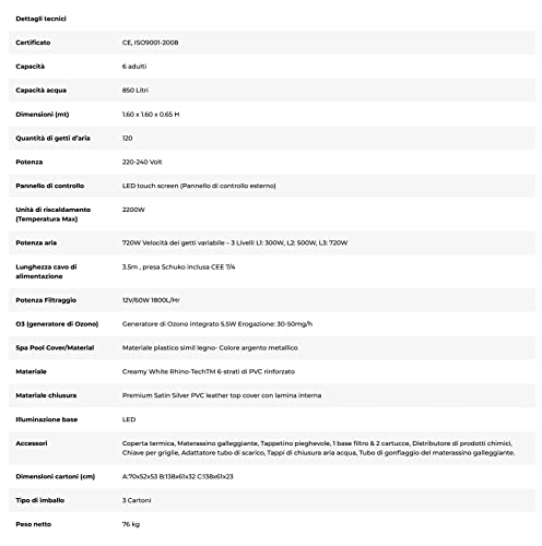 Details: The new TRIBECA spa features an elegant dark walnut-like finish. This stunning spa packs all the rigidity of a traditional spa without sacrificing portability. Surrounded by 360 degrees of variable power bubbles, for an immersive relaxation session. For maximum comfort, enjoy the headrests and pillows included in the spa. The Tibeca bath offers space for 6 people. Accessories included: Thermal Blanket Floating Mat Folding Mat 1 Filter Base and 2 Cartridges Chemical Distributor Inflation Hose Wrench for Grills Drain Hose Adapter, Air Locking Water Caps. Features: Capacity: 6 adults Water capacity: 850 liters Dimensions (mt)1.60 x 1.60 x 0.65 H Air jet quantity120 Power supply: 220-240 Volt Control panelTouch screen LED (external control panel) Heating unit (maximum temperature)2200W Air Power720W VariVariVariVariVarious. VariVariVariVariVariVariVari3 levels L1: 300W, L2: 500W, L3: 720W Power cable length 3.5 m, Schuko socket included CEE 7/4 Power filtering 12V/60W 1800L/Hr O3 (ozone generator)Integrated ozone generator 5.5W Output: 30-50 m. g/h g/h h g/h Material pool spaWood Plastic material - Metallic silver Colour materialRhino-TechTM cream white 6 layers of reinforced PVC Closing materialPremium satin silver PVC faux leather top cover with inner film Lighting baseLED AccessoriesThermal blanket, Floating mattress, Folding mat, 1 filter base and 2 cartridges, Chemical dispenser, Grid key, Drain hose adapter, Water and Inflinflinflinflinflinflinfl Air closing caps Floating mat Dimensions of the cart(cm)H:70x52x53 B:138x61x32 C:138x61x23 Packing type3 cartons Net weight: 76 kg