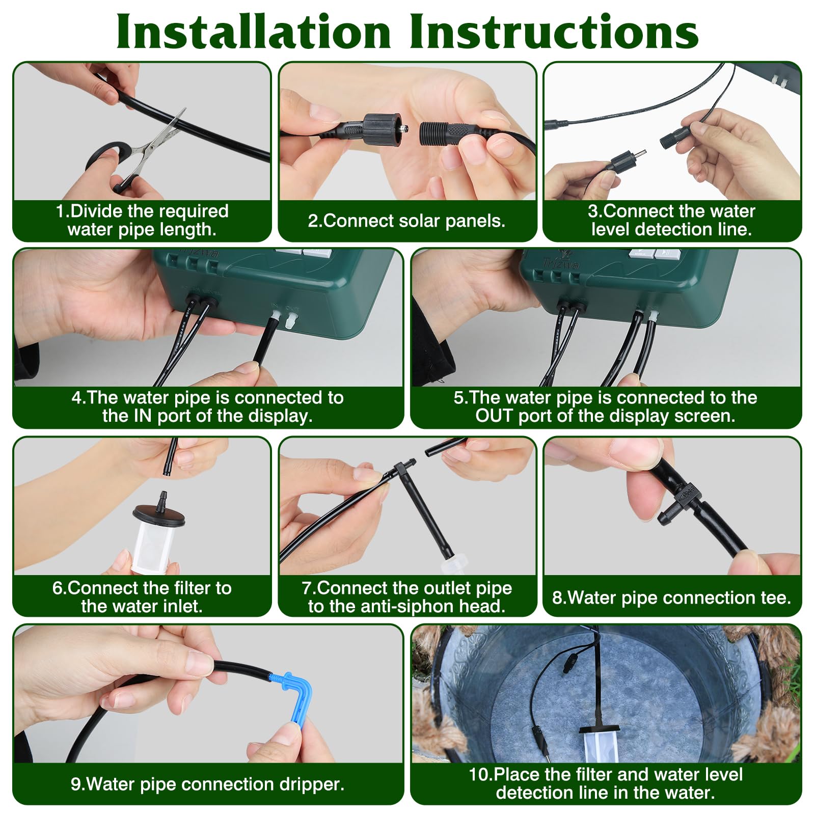 - [You will get]solar panel*1,timer controller*1,water pipe 15m*1,dripper*15,tee head*15,filter*1,anti-siphon*1,screw*2,instruction manual*1,water level sensor*1,ground plug*1,help you DIY your own drip irrigation system,suitable for watering plants in lawns,courtyards,hanging baskets,flower beds,and greenhouses.The watering flow rate is 400ml/min to make plants better absorb water and grow more vigorously.