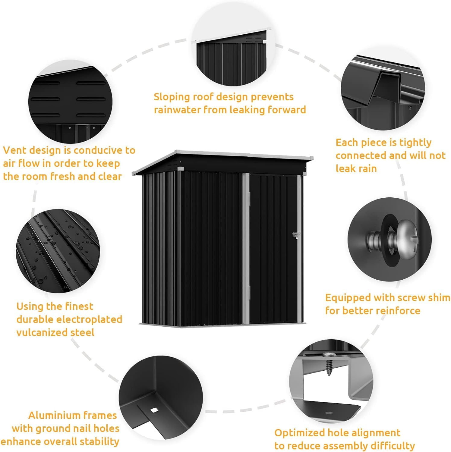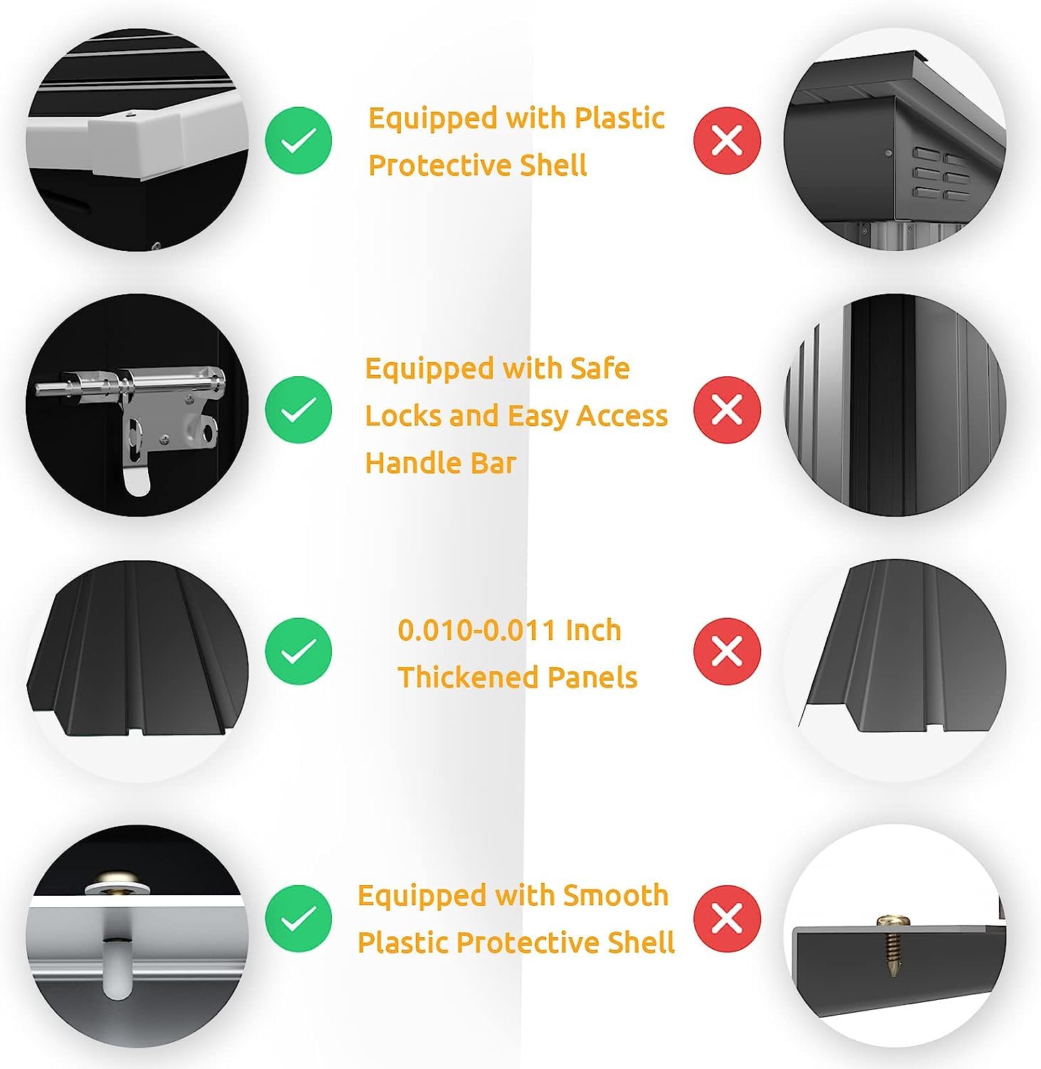 - 🏡【Durable & Sturdy Lifetime Storage Shed】 Constructed with thicker galvanized steel and fewer accessories, this lifetime shed is rustproof and UV-resistant. The overlapped wall panels are waterproof and moisture-resistant, ensuring worry-free use in all weather conditions. items and enhance the safety, preventing small animals from accidentally entering.
