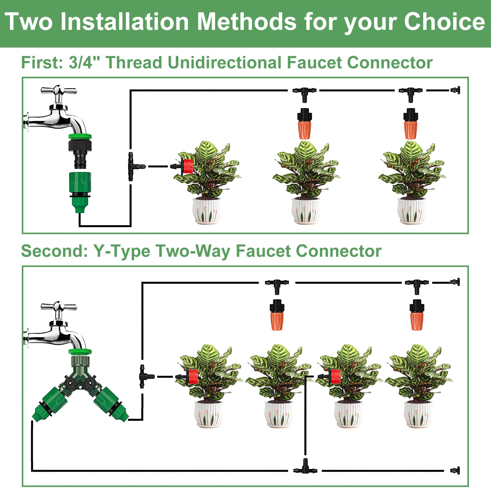 - Applicable Faucet: The package of this plant watering device will include Y Shape 2-way Faucet Connector and Convertible 1/2" and 3/4" Threaded Faucet Connector, which will not only fit for threaded faucets but also fit for non-threaded faucets. You can just simple install to start watering the plants right away without any digging or plumbing