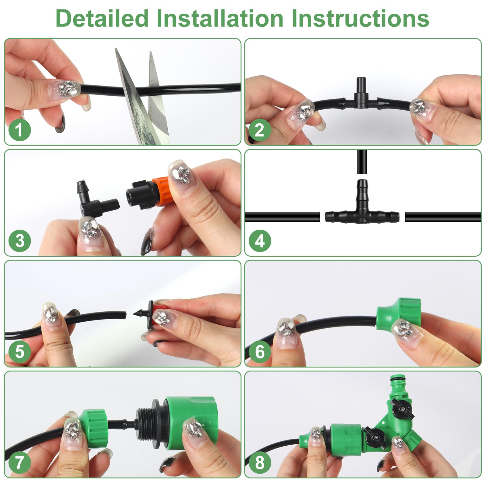 - Please Note: Please put the connected part of the hose into the hot water for 10 seconds before connecting this drip irrigation system and make sure all the spikes are deep into the hose then the irrigation system can go