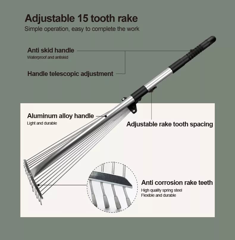- 15 TEETH RAKE: Fifteen flexible round tines mounted in a heavy gauge pressed steel frame and zinc plated for corrosion protection. Spread open 520mm, closed 200 mm.