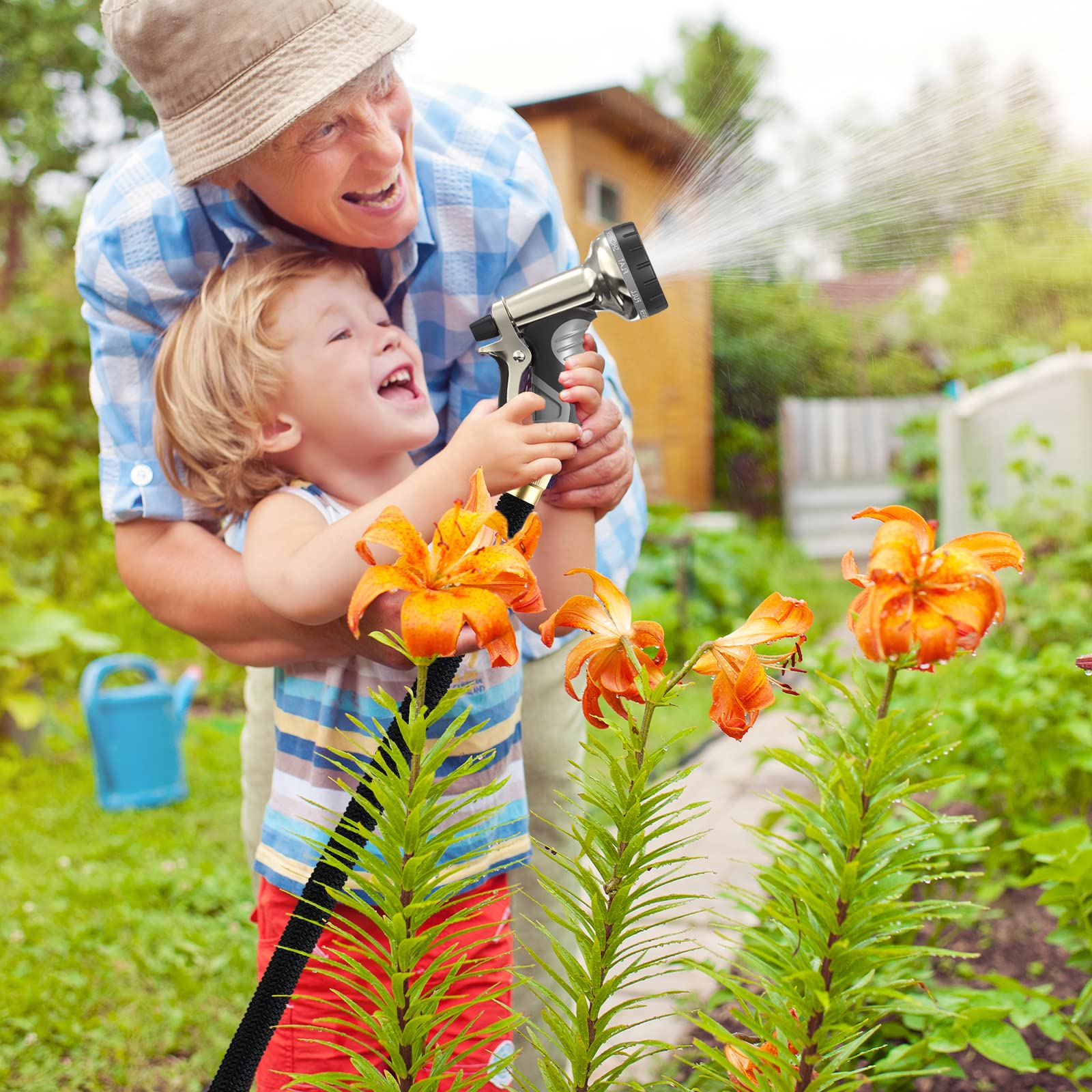 - 🌻9 Spray Patterns: This garden hose spray gun choose from mist, flat, vertical, jet, full, soaker, angle, cone, and shower spay patterns to meet any and all of your watering needs. The adjustable settings provide a variety of water pressures for everything from patio cleaning to misting delicate flowers in your garden.