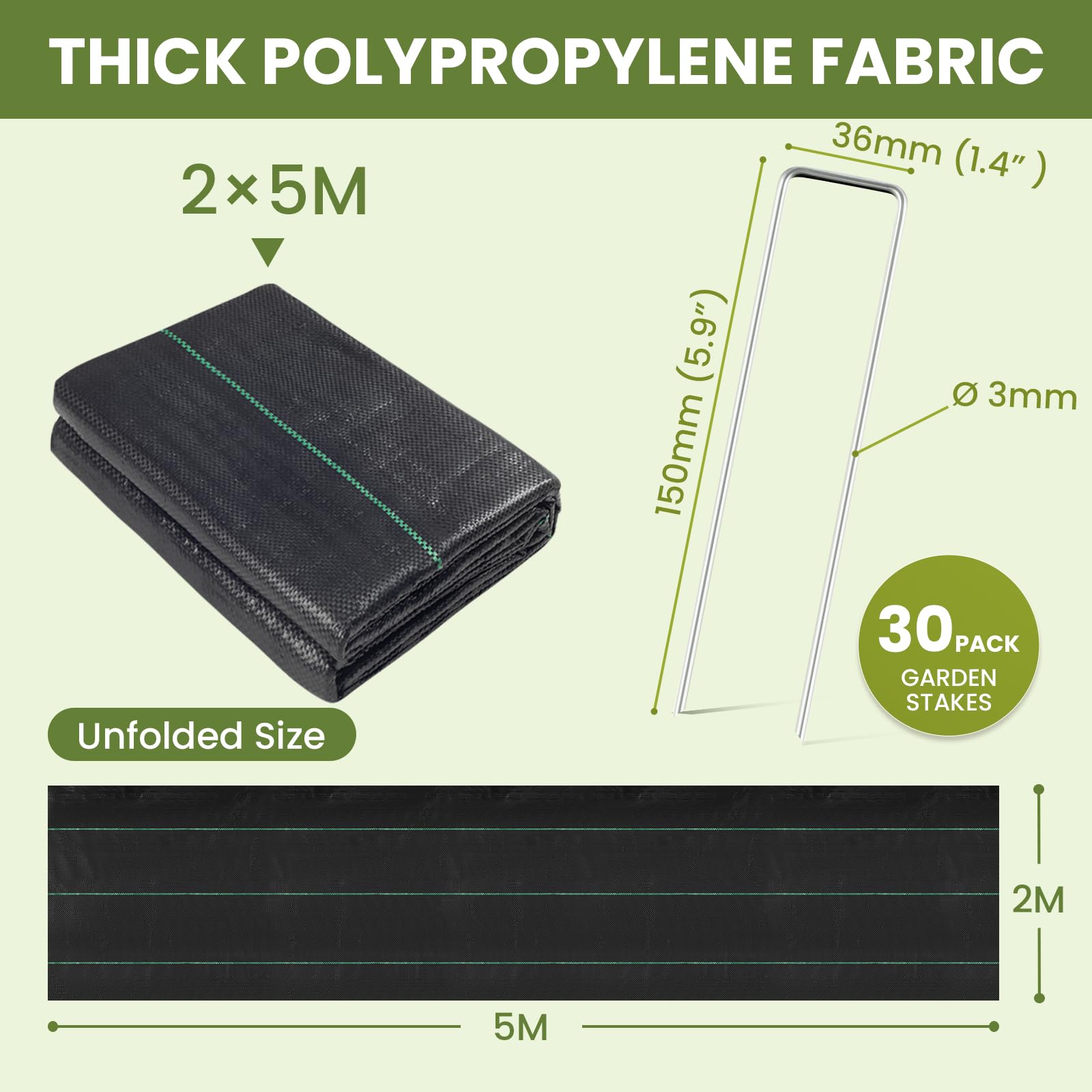 - 【Package List】 Comes in one package containing 1 piece of 2x5m weed suppressant membrane and 30pcs U-Shaped garden pegs (For safe transport, the garden pegs are inside the folded weed barrier. Please open it to find the pegs). Ground stake measures 150mm/6" in length, 36mm/1.4" in width, nail diameter is 3mm, rust resistant and not easy to deform, ideal for securing weed control membrane/artificial grass/netting/tents/tarps/ground cover/hoses and more