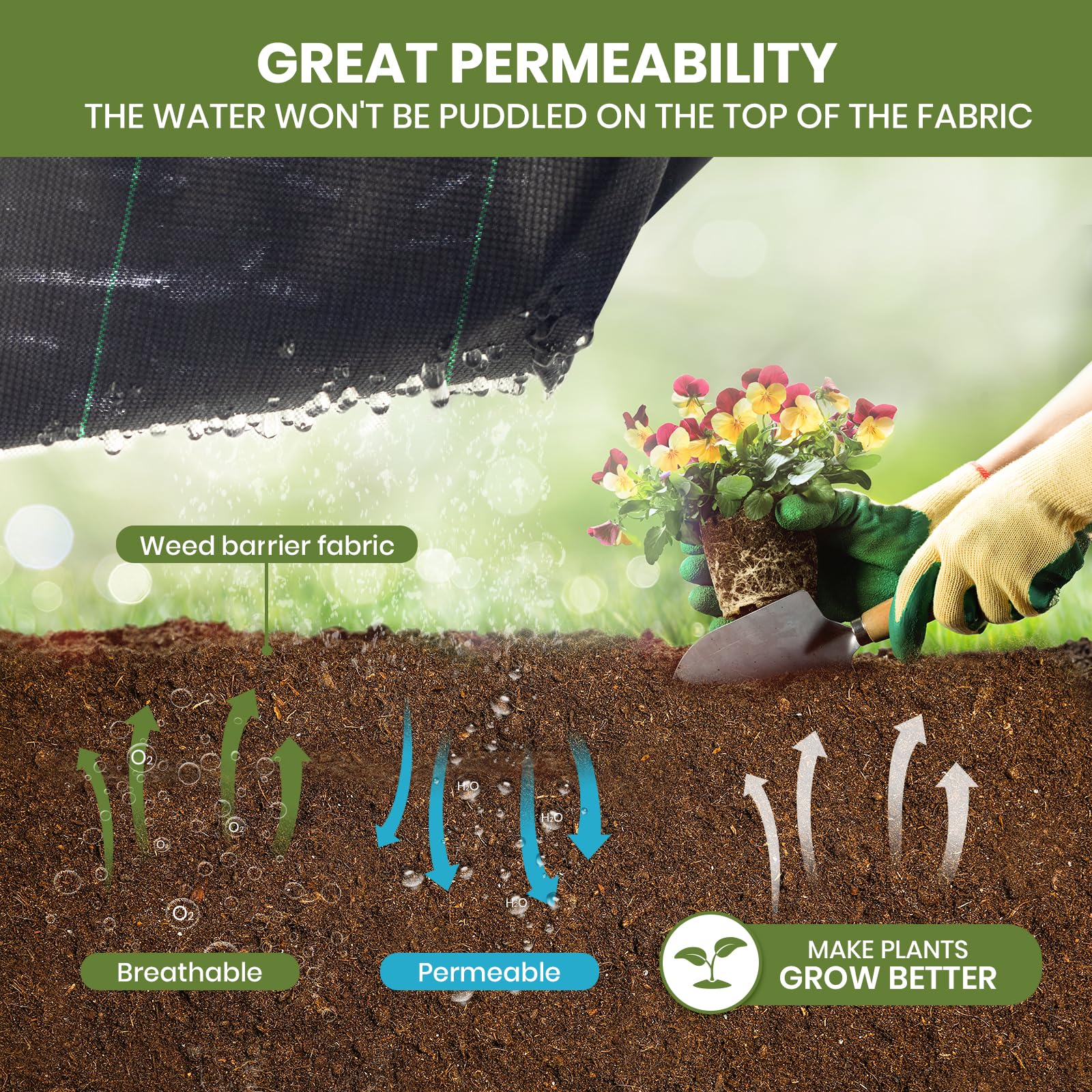 - 【High Permeability & Soil-Friendly】 This landscape fabric offers excellent permeability, allowing air, water, and nutrients to reach plant roots. This promotes healthy plant growth. The black color also minimizes light while effectively curbing weed growth around flower beds, trees, and shrubs