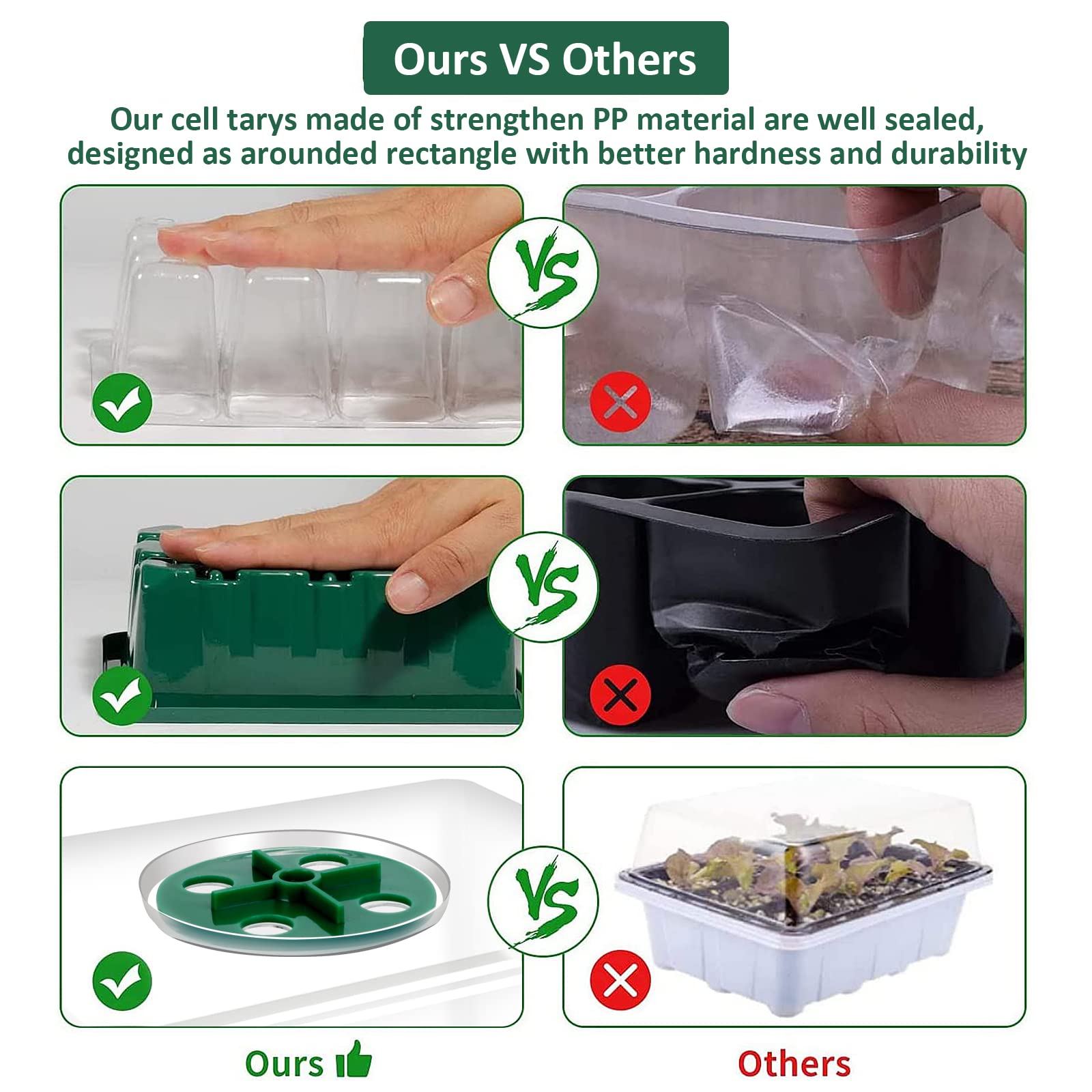 - Moisture Control Design: Each cell of the Seed Trays is equipped with a drainage hole that does not cause lazy roots due to excessive watering, 4 adjustable ventilation openings on the transparent dome of the seed starter tray, which allows you to adjust the ventilation to control the temperature and humidity of your seedling environment, which effectively protects the healthy growth of the root system.