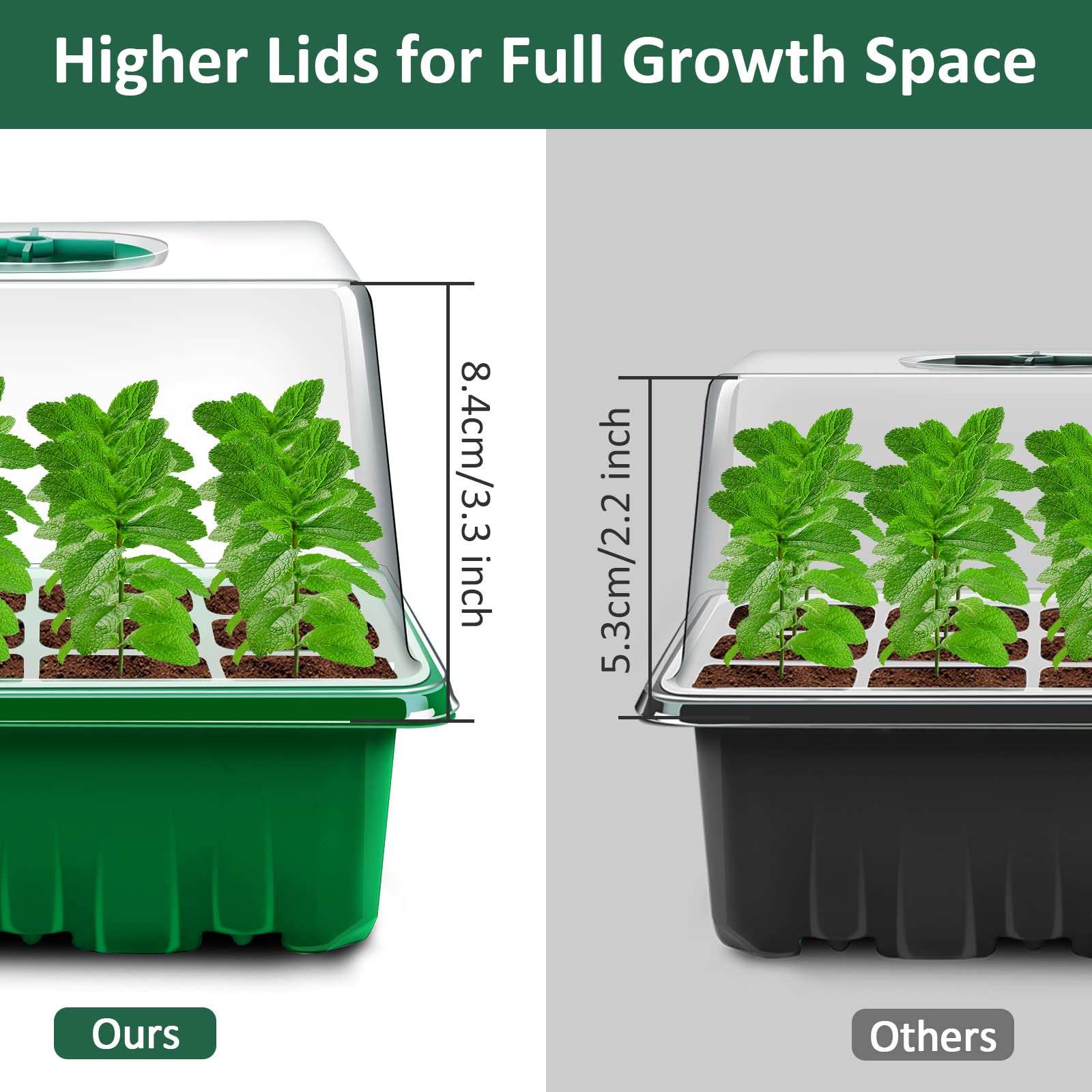 - Upgraded Raised Lid: The height of the plant germination tray lids has been increased to provide enough space for flowers, vegetables, fruit, herbs and other plants to grow. It is not only suitable for seed germination, but also for germination of plant cuts. The tender plants can stay in the seed tray for longer.
