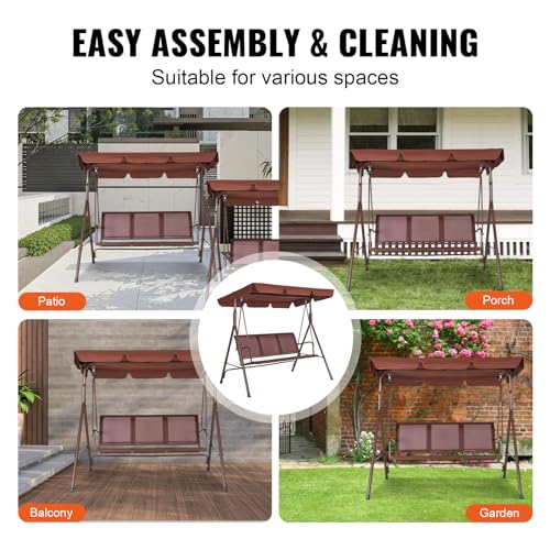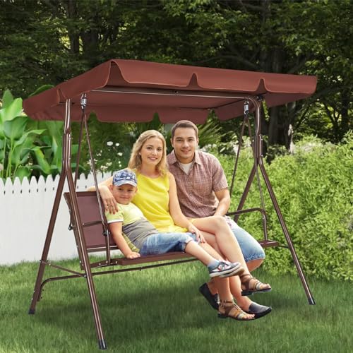 VEVOR 3-Seat Patio Swing Chair, Outdoor Patio Swing with Adjustable Canopy, Porch Swing with Armrests, Teslin Fabric and Alloy Steel Frame, for Balcony, Backyard, Patio, Garden, Poolside, Brown