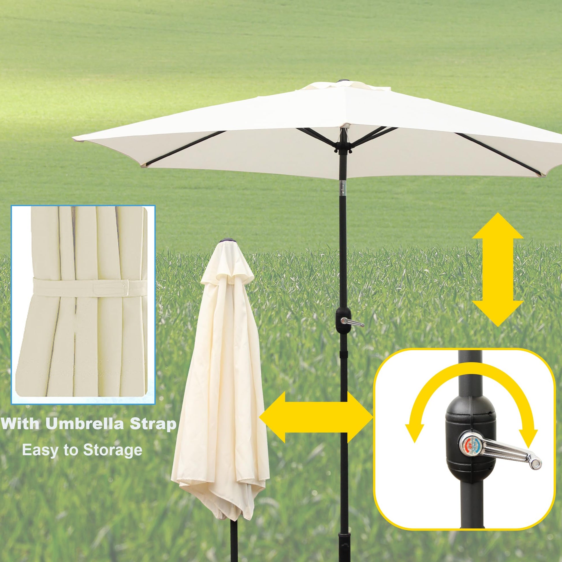 - TILT & CRANK MECHANISM:Simply turn the crank to put the parasol up or down, and the 6 steel ribs at the top of the pole will straighten out or fold up depending on which way you turn it. Easily adjust the tilt angle and height of the awning through the button to obtain the best sun protection effect,ensuring you can always remain safely in the shade.