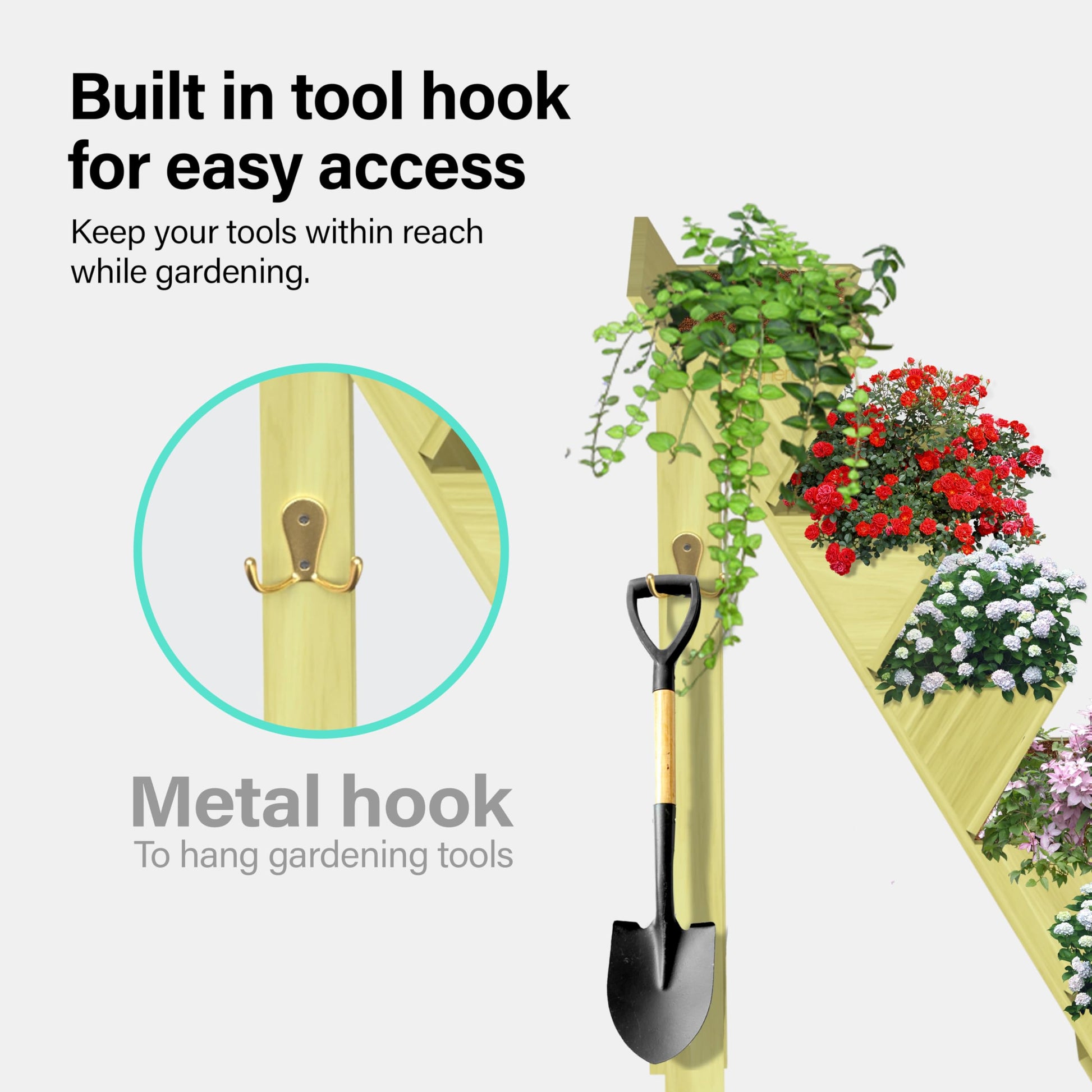 - Convenient Tool Storage: Equipped with a metal hook on the side, this wooden planter allows you to hang gardening tools within easy reach, simplifying your gardening experience