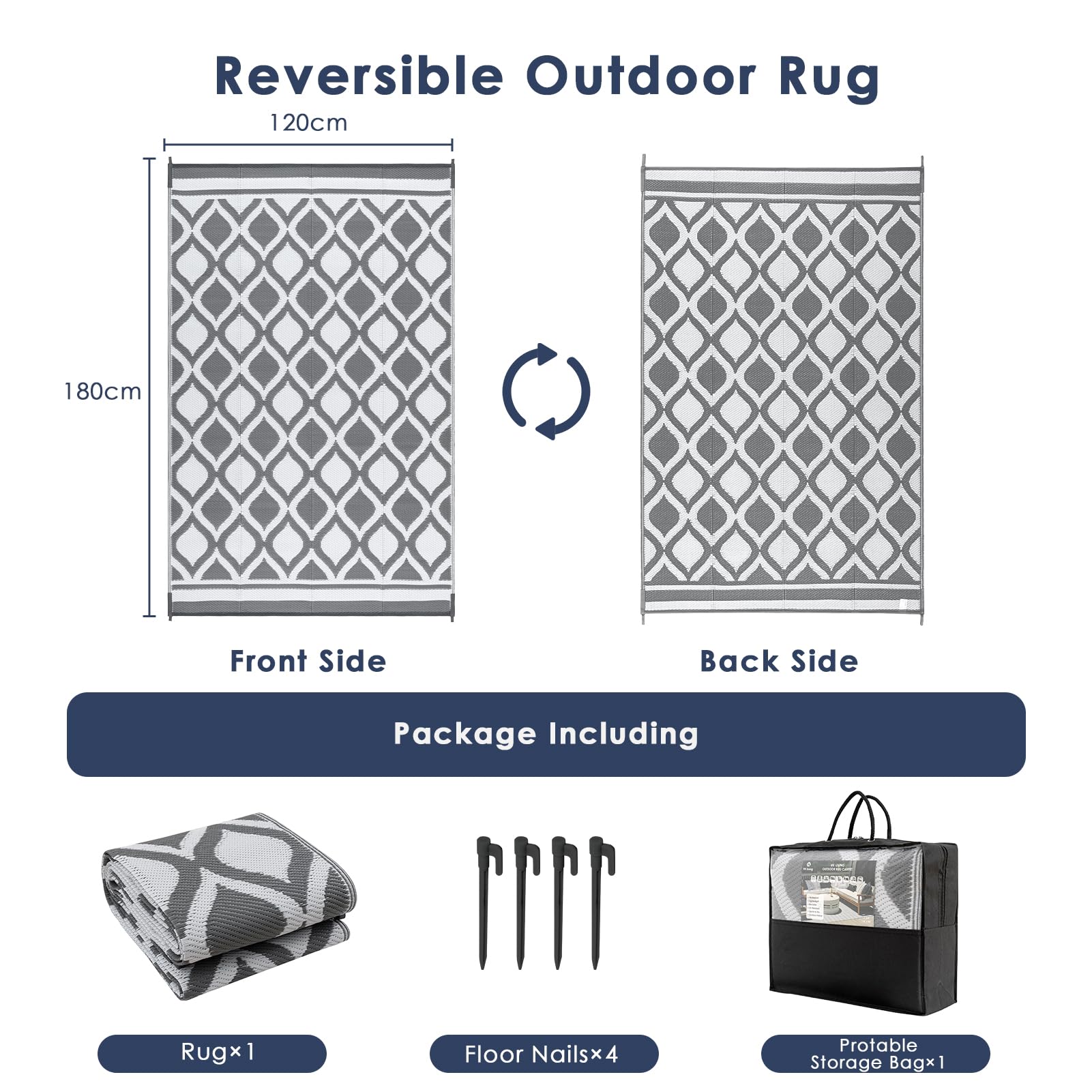 - Reversible Design: Outdoor rug is designed with a double-sided pattern so you can easily flip it over and extend the life of your rug. The 4 corner loops of the reversible outdoor mat and the included plastic ground pegs hold the outdoor mat in place so it won't slip or blow away in the wind. Perfect for outdoor use