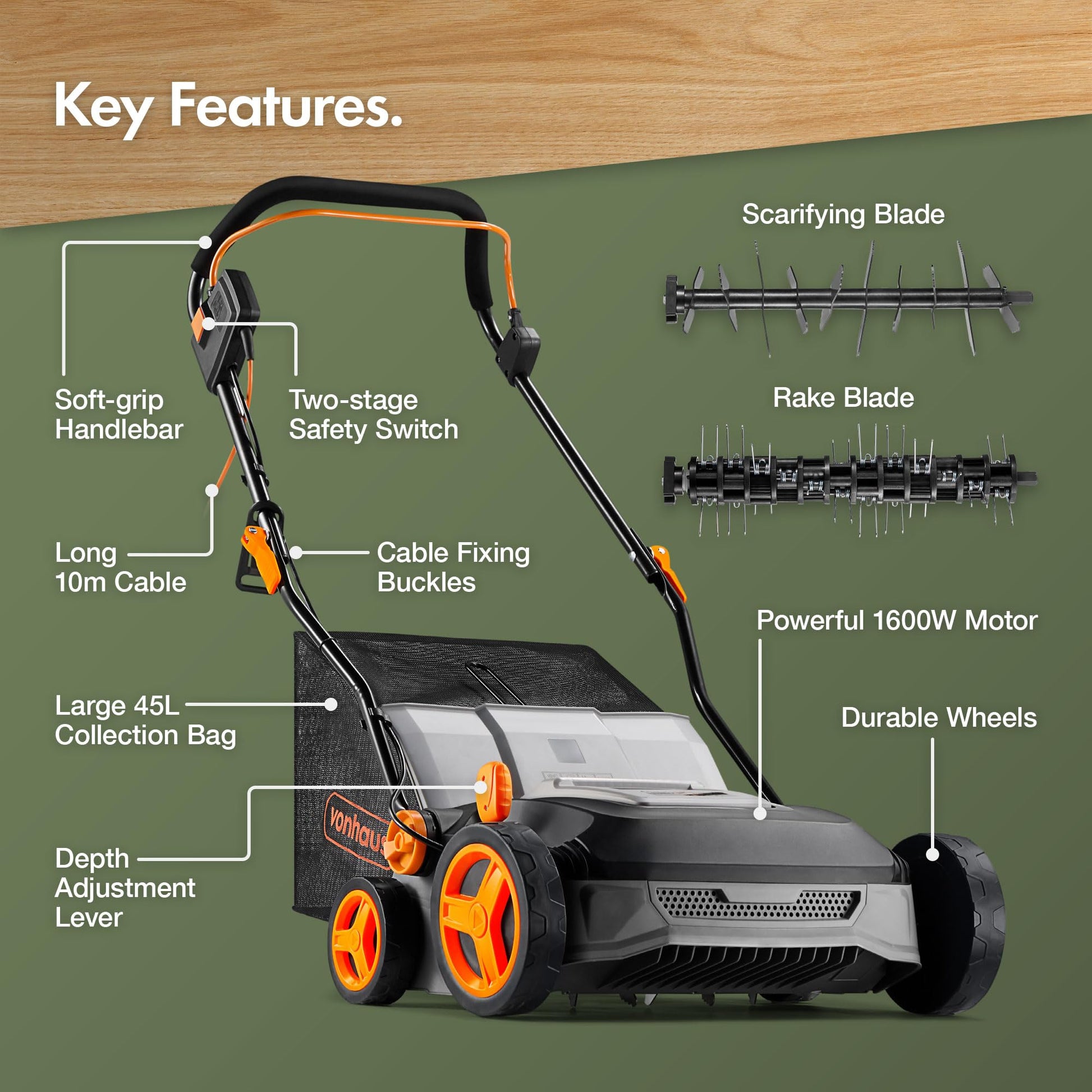 - COVER YOUR LAWN WITH EASE: Say hello to a healthier year-round lawn with the VonHaus 1600W scarifier. The large 37cm working width and 45L collection box make light work of thatch, moss, and debris removal.