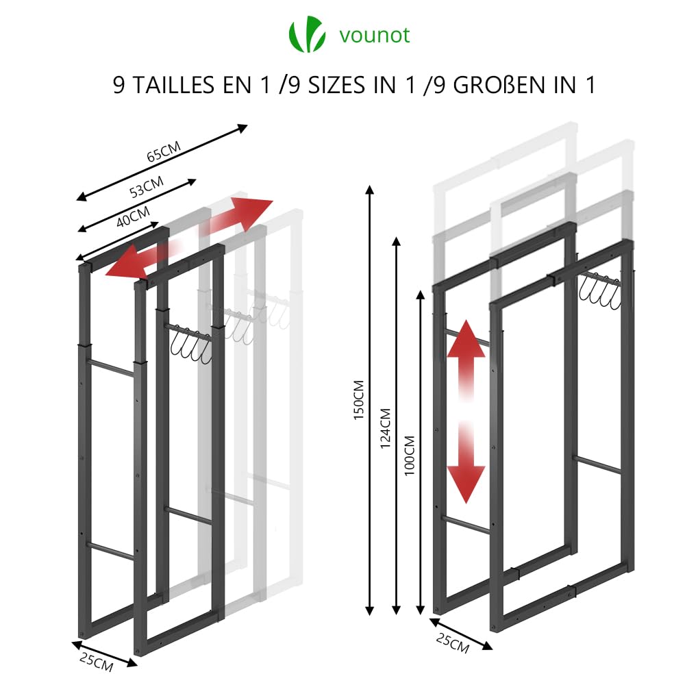VOUNOT Firewood Log Rack, Retractable Metal Log Store Holder for Outdoor or Indoor, 9 Adjustable Sizes, Maximum dimension 65 x 25 x 150 cm, Black