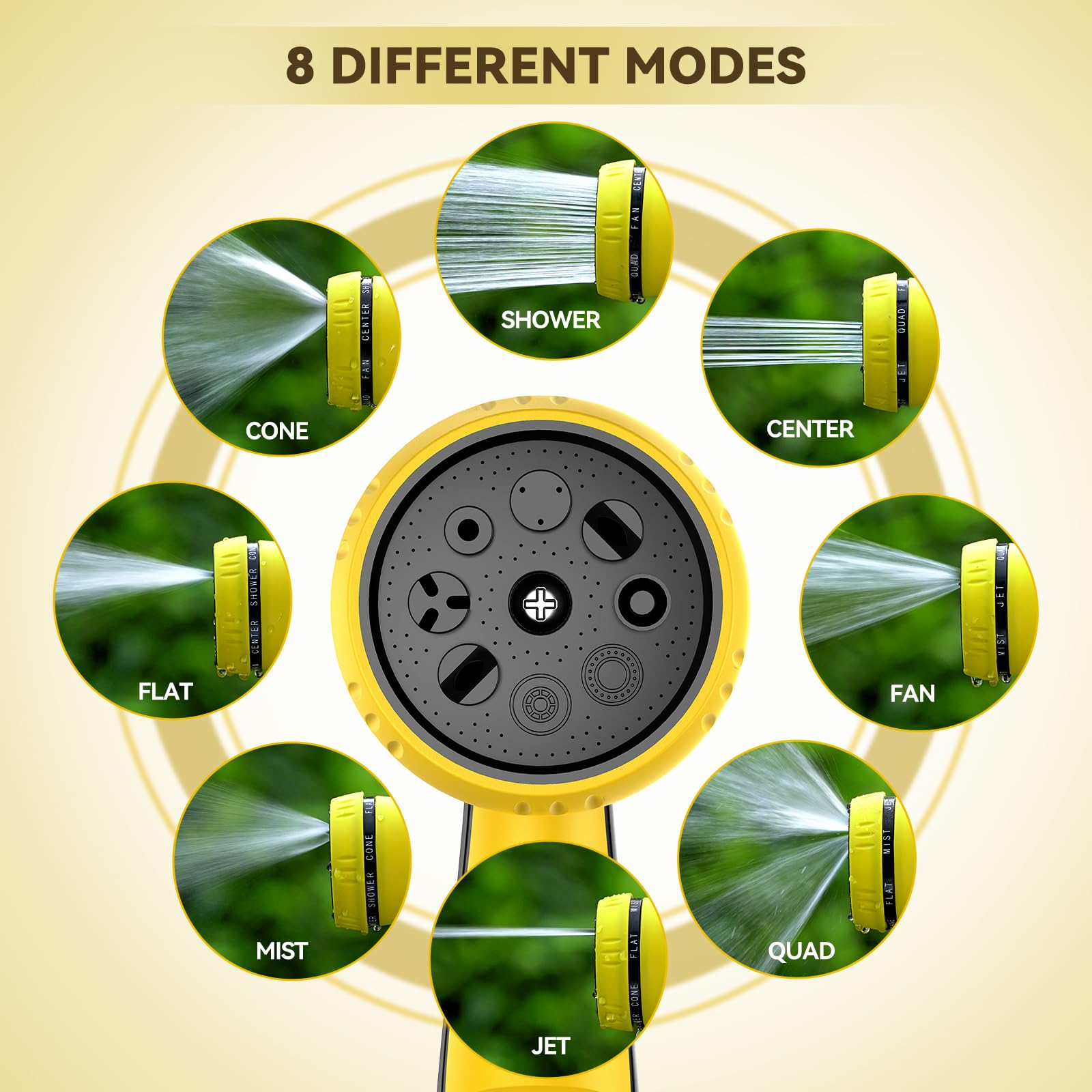 - 【8 Adjustable Patterns Hose Nozzle】The hose pipe spray gun has 8 watering settings (SHOWER、CONE、FLAT、MIST、JET、QUAD、FAN、CENTER), from high pressure to soft level, to meet all your watering needs