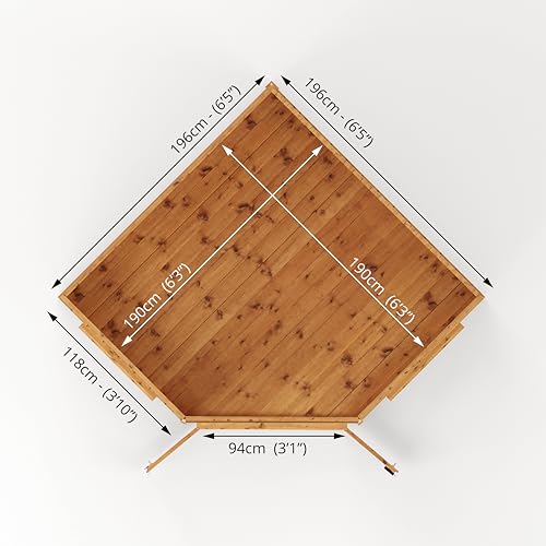 Details: If you're in search of a versatile space for crafting, entertaining, or simply unwinding after a long day, Our 7 x7 Premier Corner Summerhouse may just fit the bill. Designed to fit snugly into the corner of your garden, it offers panoramic views and maximises your available space, leaving more outdoor space for other features. Its two fixed windows and fully glazed French doors, all featuring shatterproof styrene, fill the interior with natural light, creating a warm and inviting atmosphere. The walls are constructed using 12mm Shiplap tongue and groove cladding to form strong, hardwearing and premium panels. The roof and floor are cut from quality tongue and groove boards. The roof is covered with heavy duty mineral felt for added weatherproof protection.