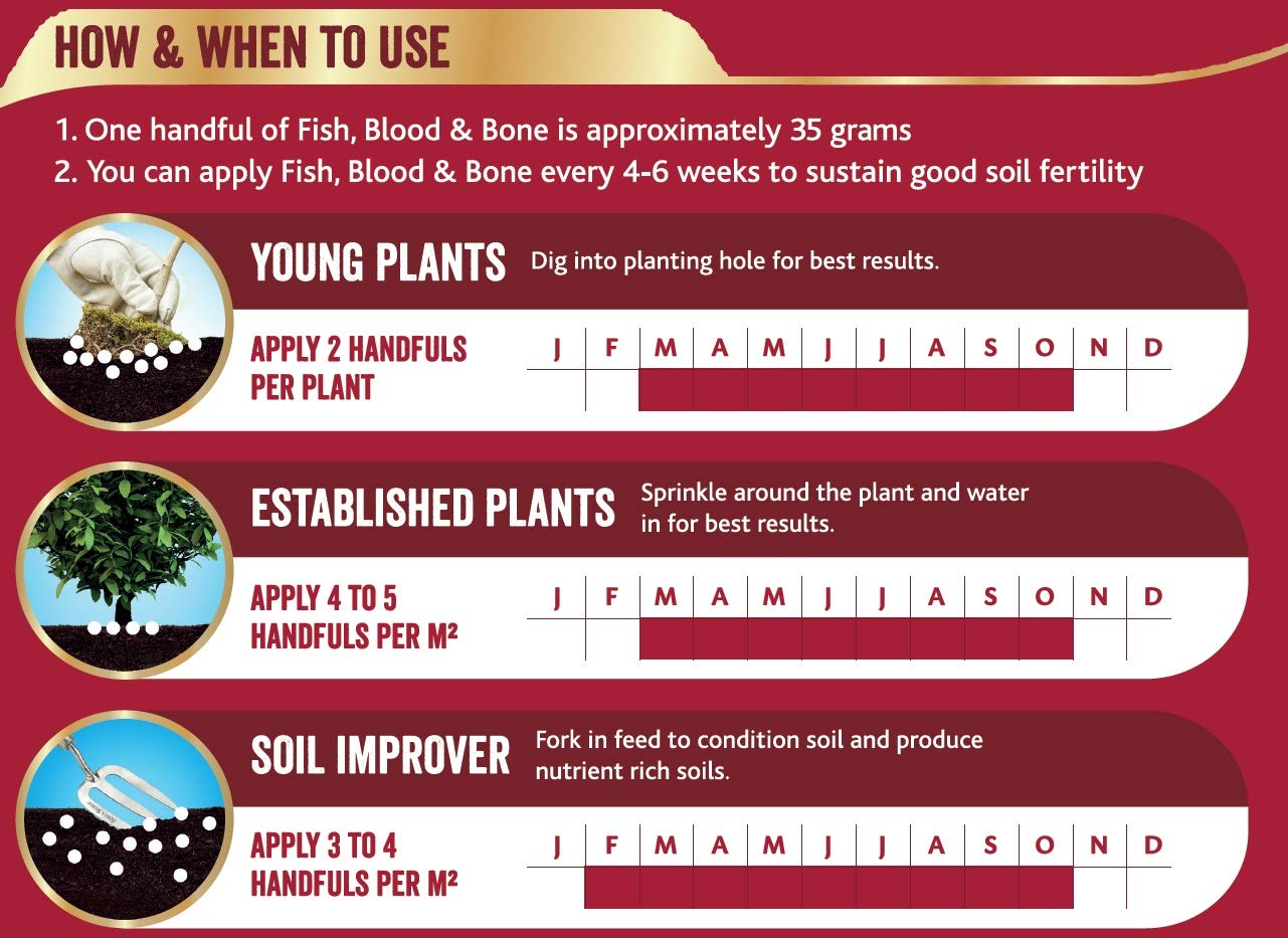- Use Fish, Blood and Bone to provide your plants with a natural food source that feeds plants nutrients slowly