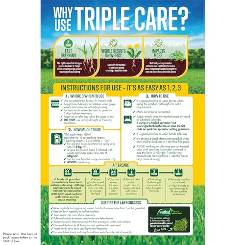 Westland Triple Care is a lawn treatment that has been formulated to deal with weeds and moss without herbicides. Balanced NPK with the right amount of nitrogen aviods weak growth, whilst promoting strong and healhty roots. Your lawn will look greener in just 3 days.