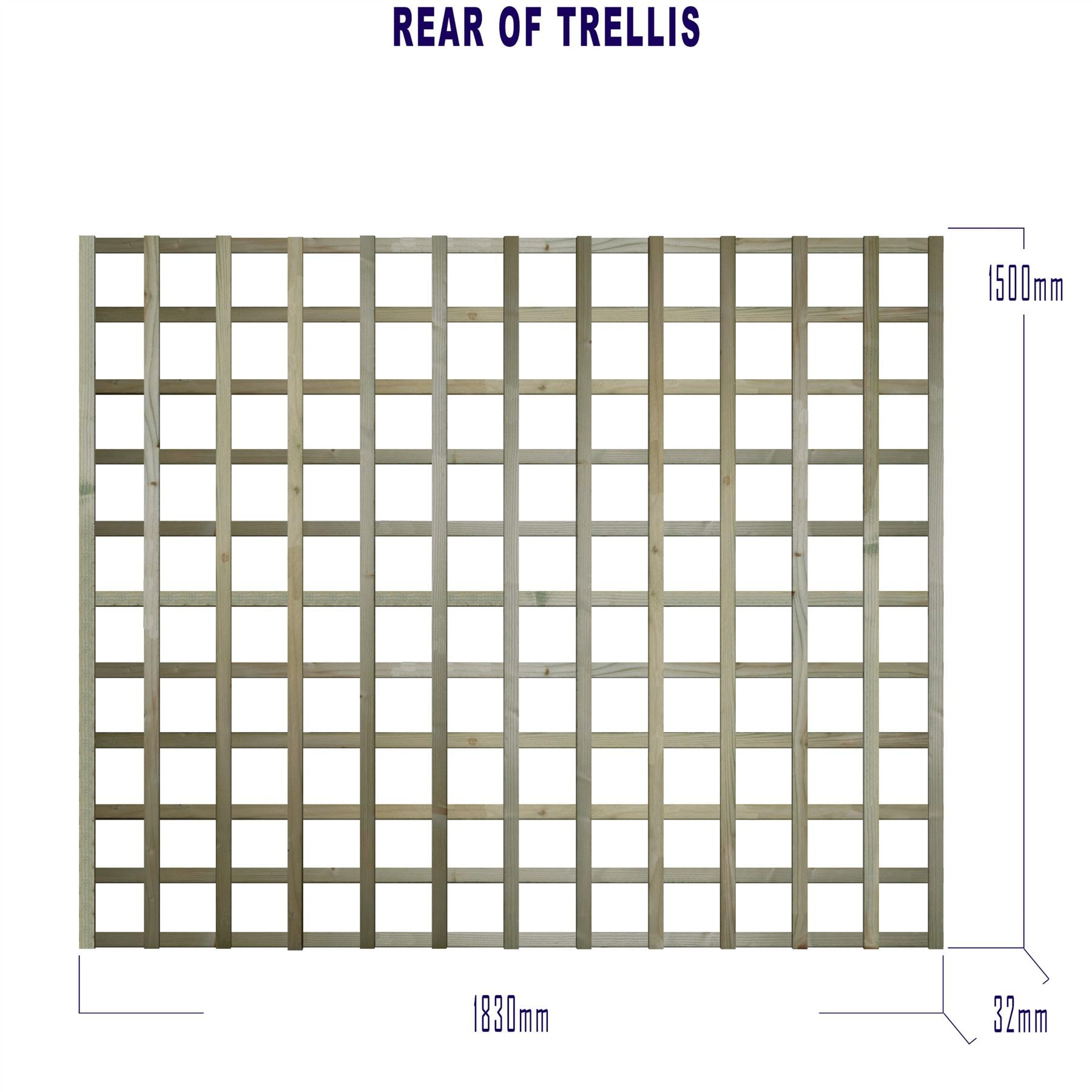 - Product Dimensions Width 6ft (183cm) x Height: 5ft (150cm) The trellis laths used on this product are rough-sawn 32mm x 16mm. The front battens are positioned horizontally along with the rear battens which are positioned vertically. Hand made in our Shropshire UK factory by one of our expert joiners. With the standard design we position the laths to provide squares between 100mm to 120mm in size the squares differ depending on the height purchased.