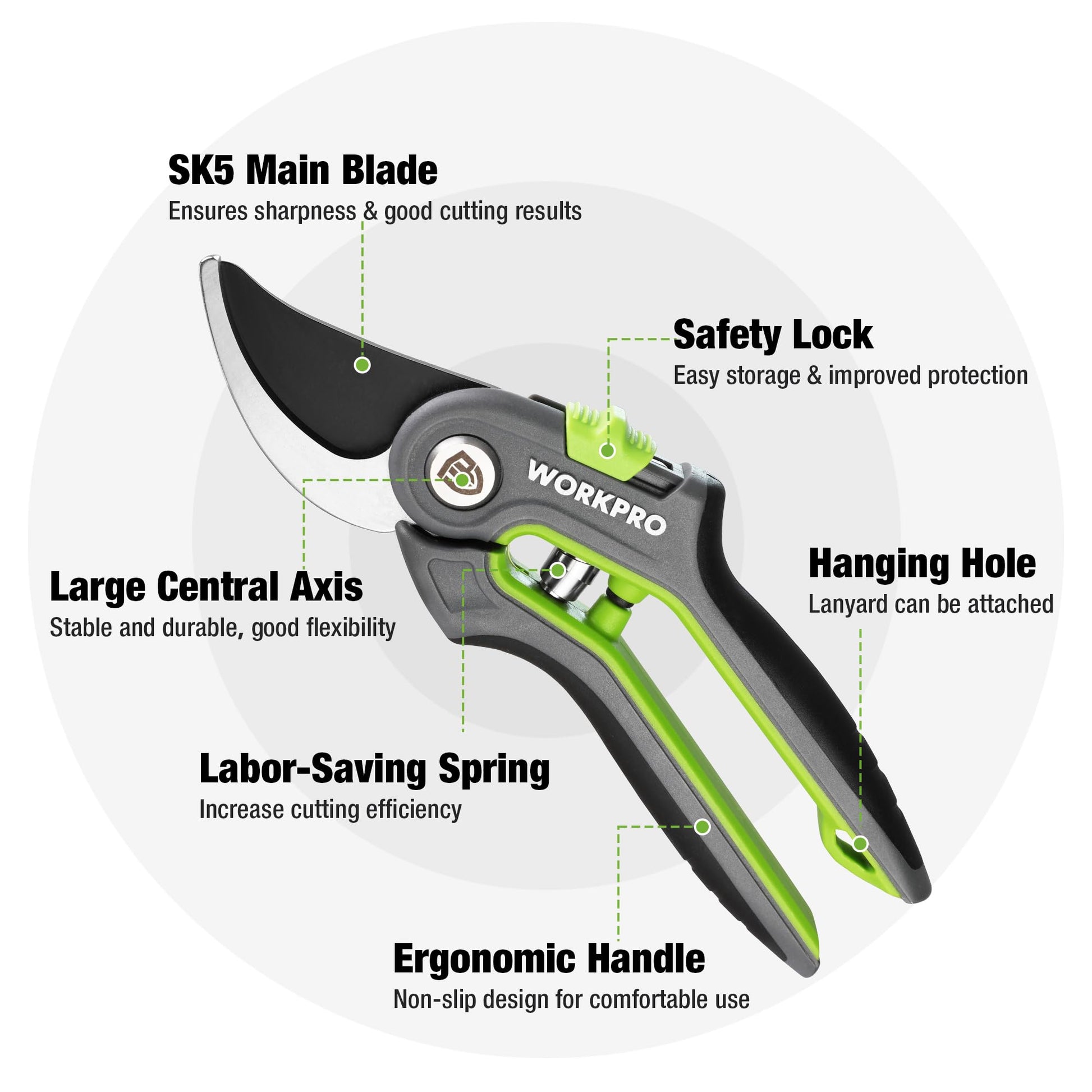 WORKPRO 2-Piece Secateurs & Pruning Scissors | Heavy Duty 210mm Bypass Secateurs with SK5 Blades and 160mm Shears | Labor-Saving Scissors with Safty Lock | Essential Garden Tools for Pruning Flowers