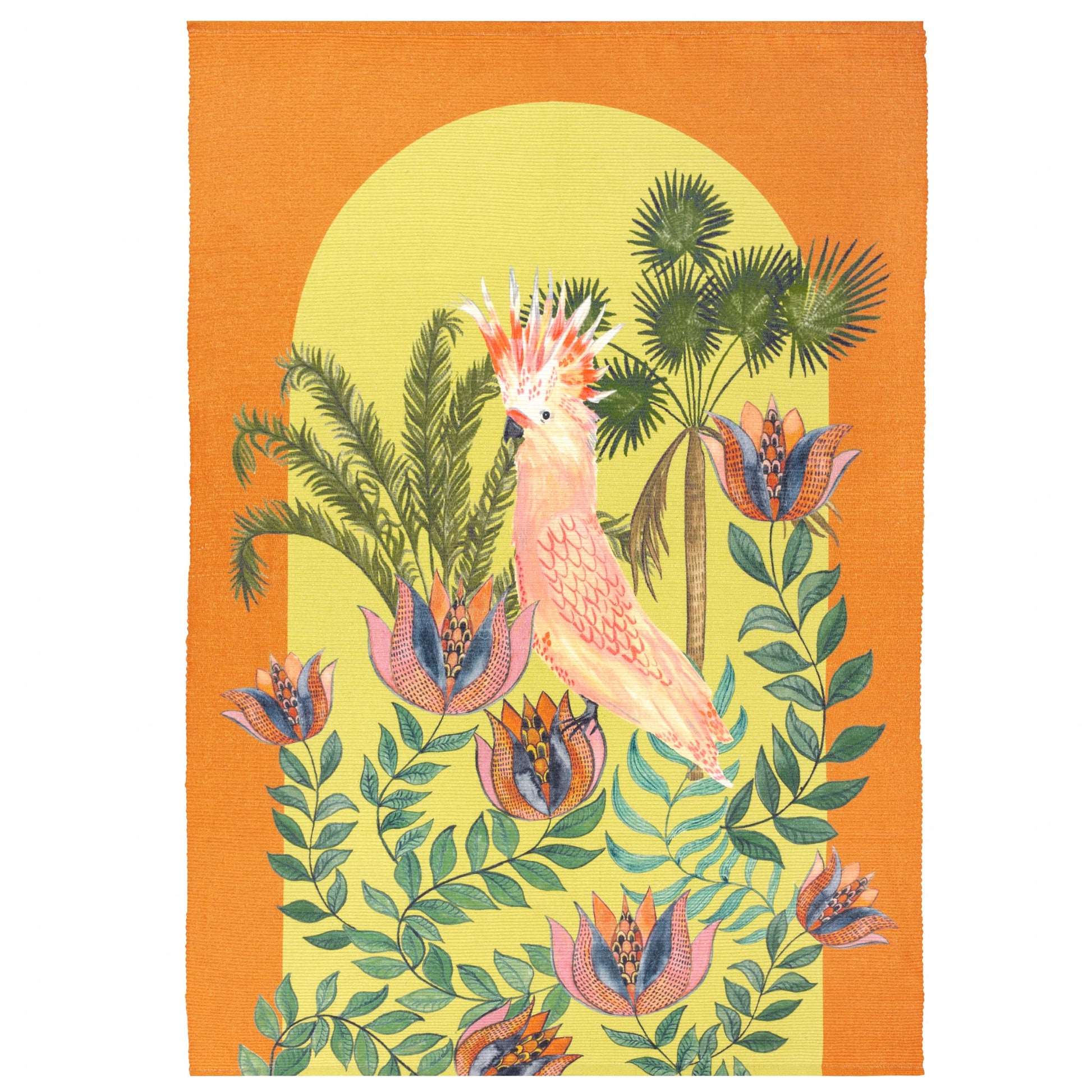 - Featuring a digitally printed design of a beautifully hand-painted cockatoo surrounded by jungle foliage set against a vivid sunset-orange background.