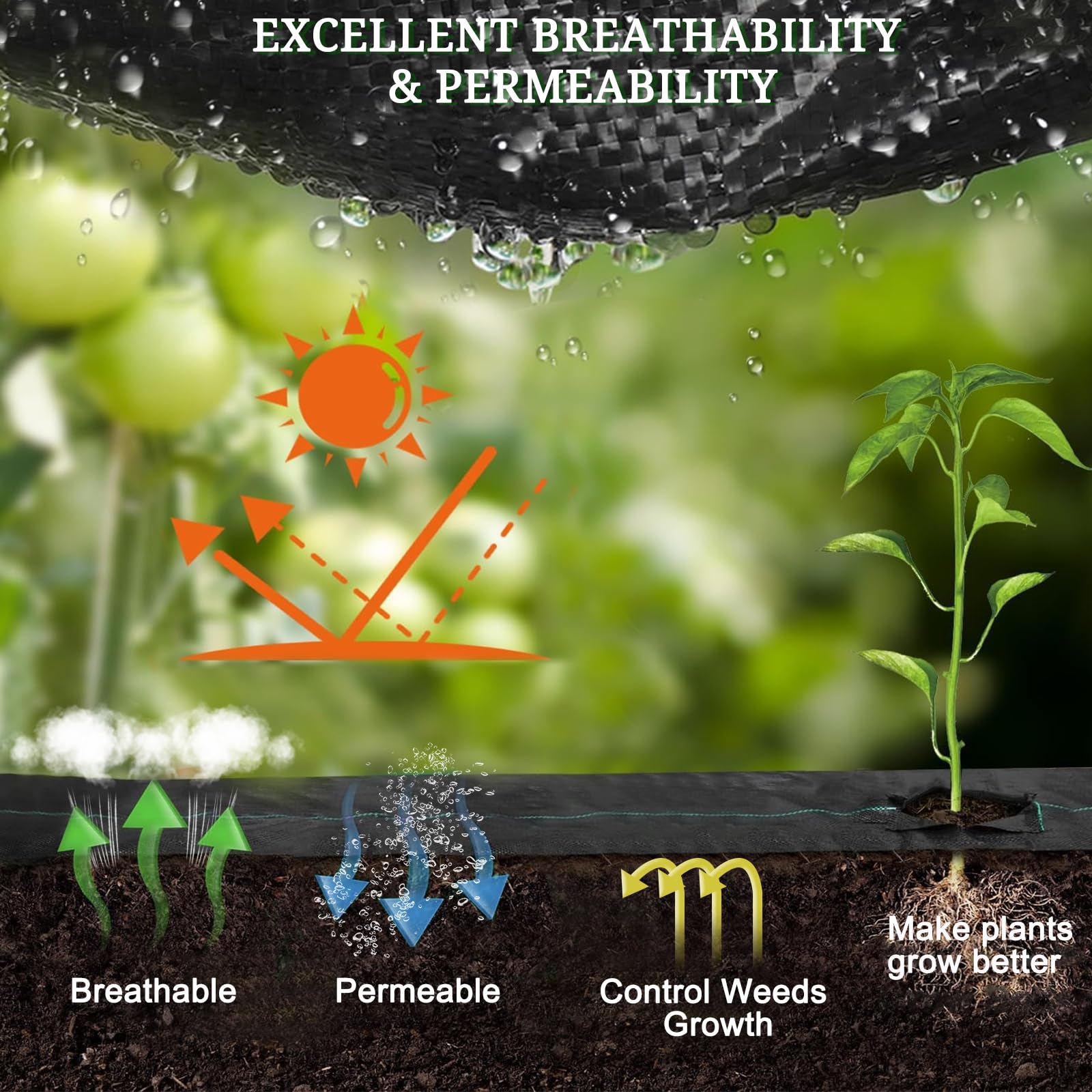 - High Permeability: Our heavy duty weed barrier with high permeability and breathability, allowing more air and water to penetrate the soil, effectively reducing erosion and driving out weeds, promoting optimal soil moisture control for healthier plants.