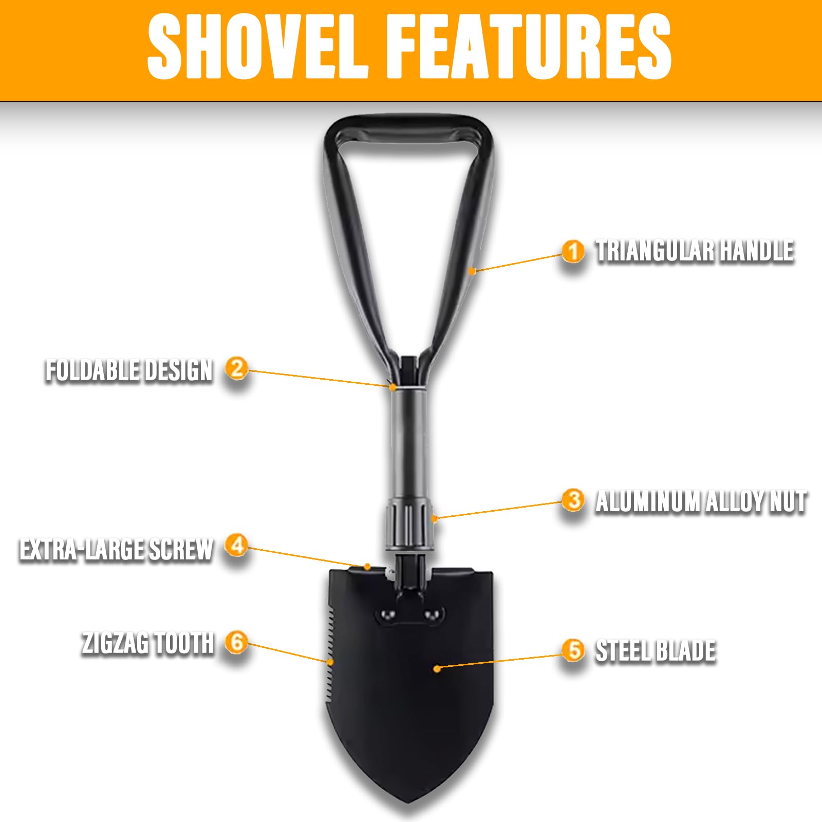 - Compact & Portable: Designed for easy storage, this 23-inch folding shovel collapses into a compact size, perfect for backpacks, car trunks, or emergency kits without taking up much space.