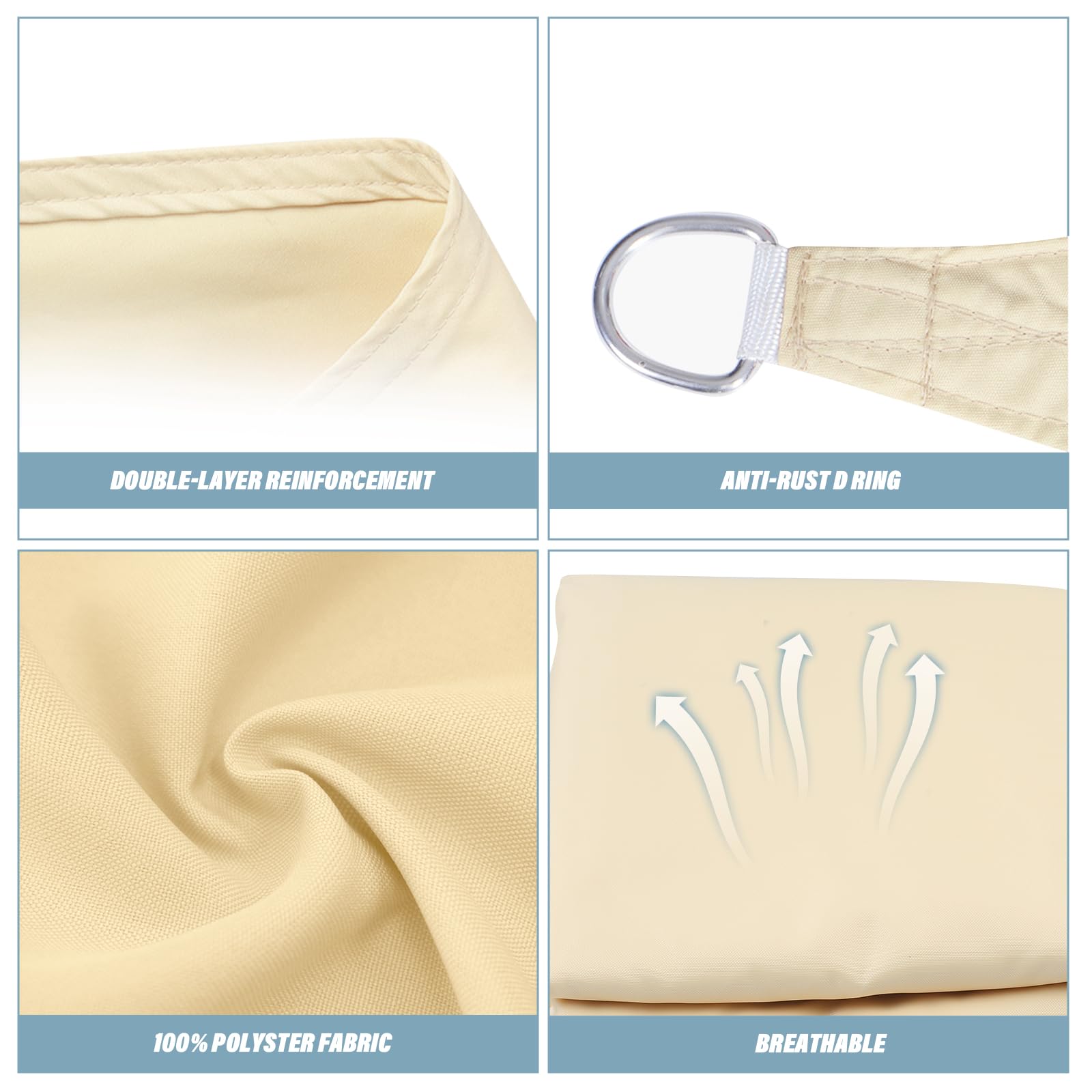 - ⛱️【95% UV Blocking】The sun sades is made of 100% high-density polyester fiber (291g/㎡ Pes polyester) with PU coating, moisture-resistant, mold-resistant, stain-resistant and odorless. It can ensure approx 95% shading. And each corner has a D-ring made of rust-proof 430 stainless steel. The D-ring is easy to hang and very stable, get with 4 long durable ropes (approx. 1.5m each) and 1 fixing set for free, which easily installs to walls, posts, fences, and even trees. Color: Off-White.
