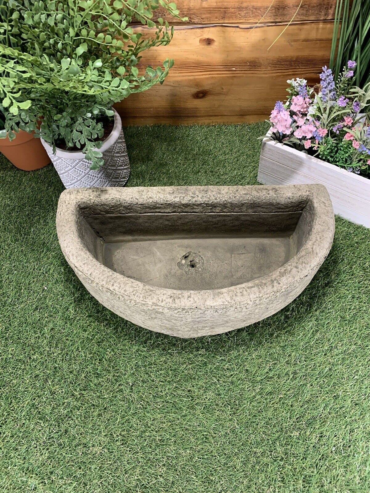Details: Stone Garden Half Circle Plant Pot Ornament Hand crafted in our shop with reconstituted stone, it is frost proof and has been treated leaving an aged appearance. Measures 16” wide x 8” deep x 5.5” high. This item weighs 10kg. Comes with drainage holes in the bottom. We have a large variety of stone ware on display at our shop if you wish to view or visit the store that is not a problem. Located in Sleaford, Lincolnshire,